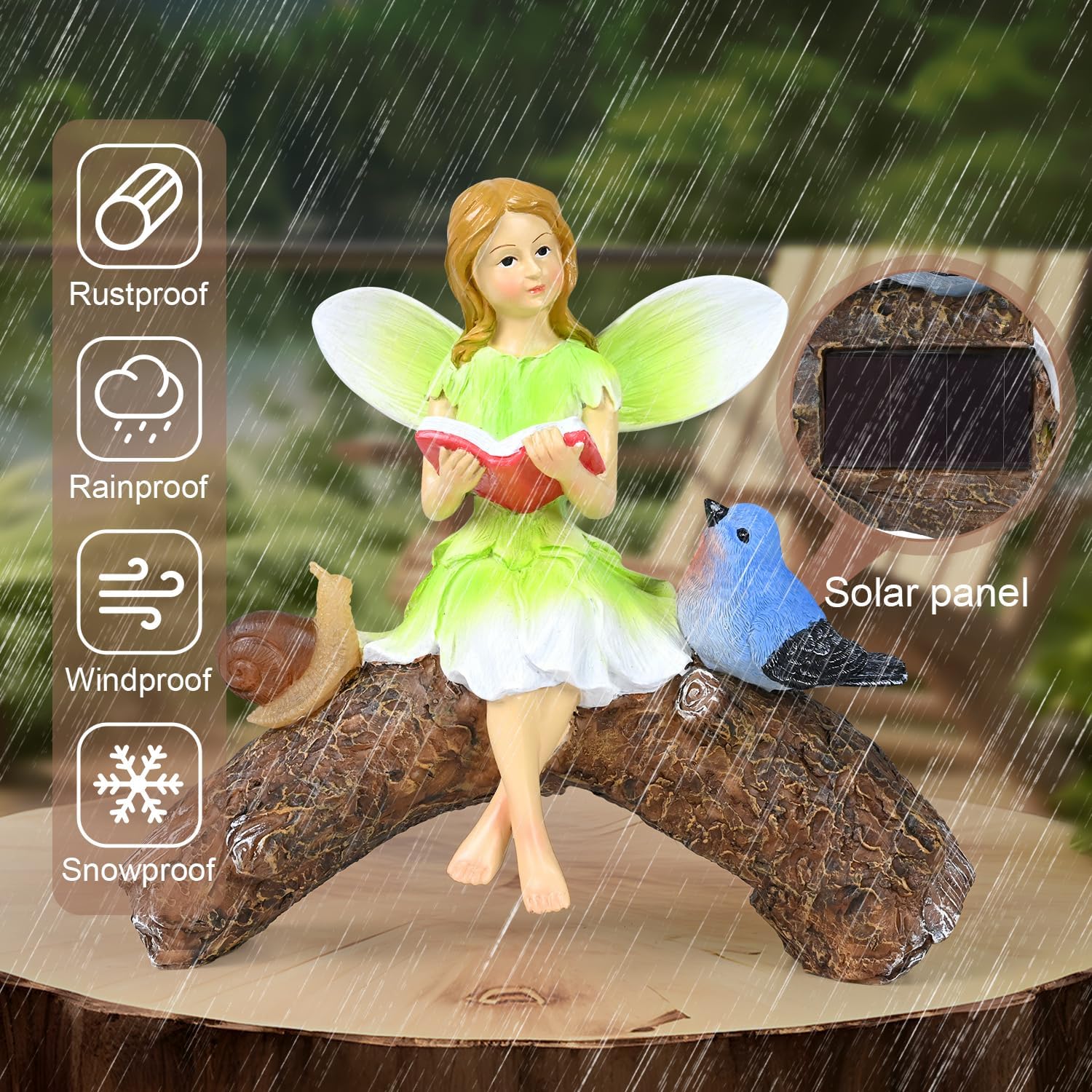 - 【BEAUTIFUL FAIRY STATUE】Yiosax garden flower fairy statue outdoor decor,features beautiful crafted details and vibrant colors,This green flower fairy statue and her two little companions, snails and birds, sat on a wooden stake reading a book,adding a lot of happy and hope to your garden,patio,backyard,lawn,window sills,flower bed