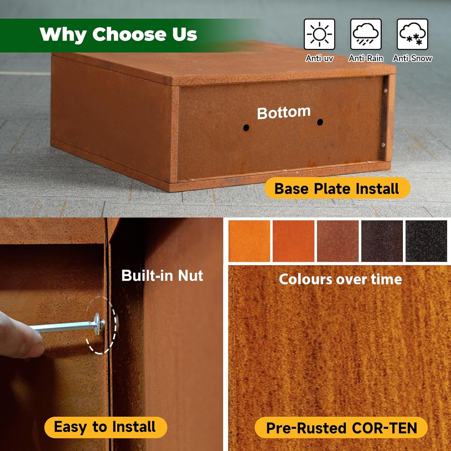 - CORTEN STEEL PLANTER - This Corten Planter is built to corten steel. Pre-Rusted and form a protective layer on the surface,Effectively protect flower pots and extend their service life to 50 years