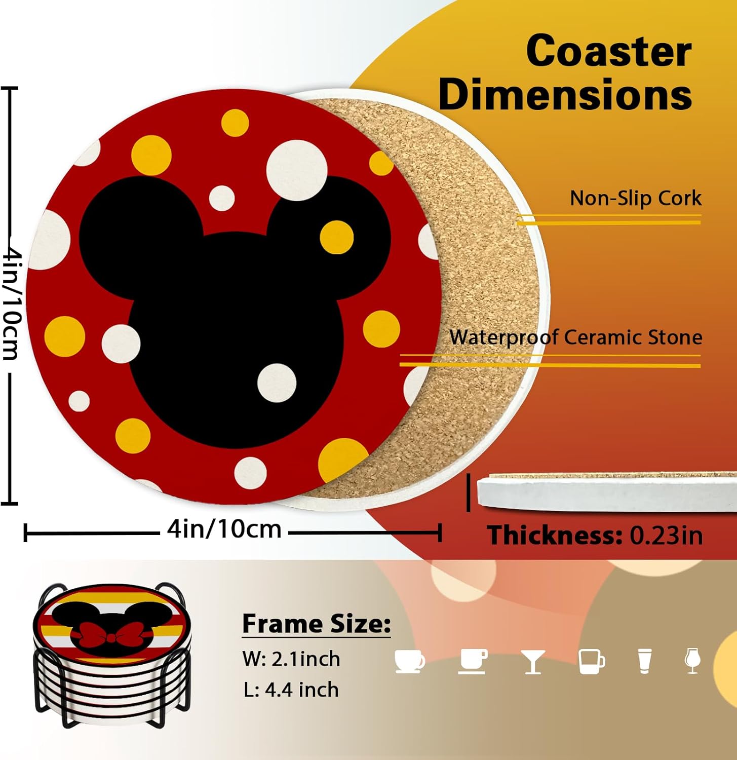 Cute Drink Coasters with Holder Set of 6, Red Yellow Absorbent Ceramic Cup Mat for Coffee Table Protection, 4 Inch Polka Dot Stripes Home Kitchen Decor Housewarming Gifts