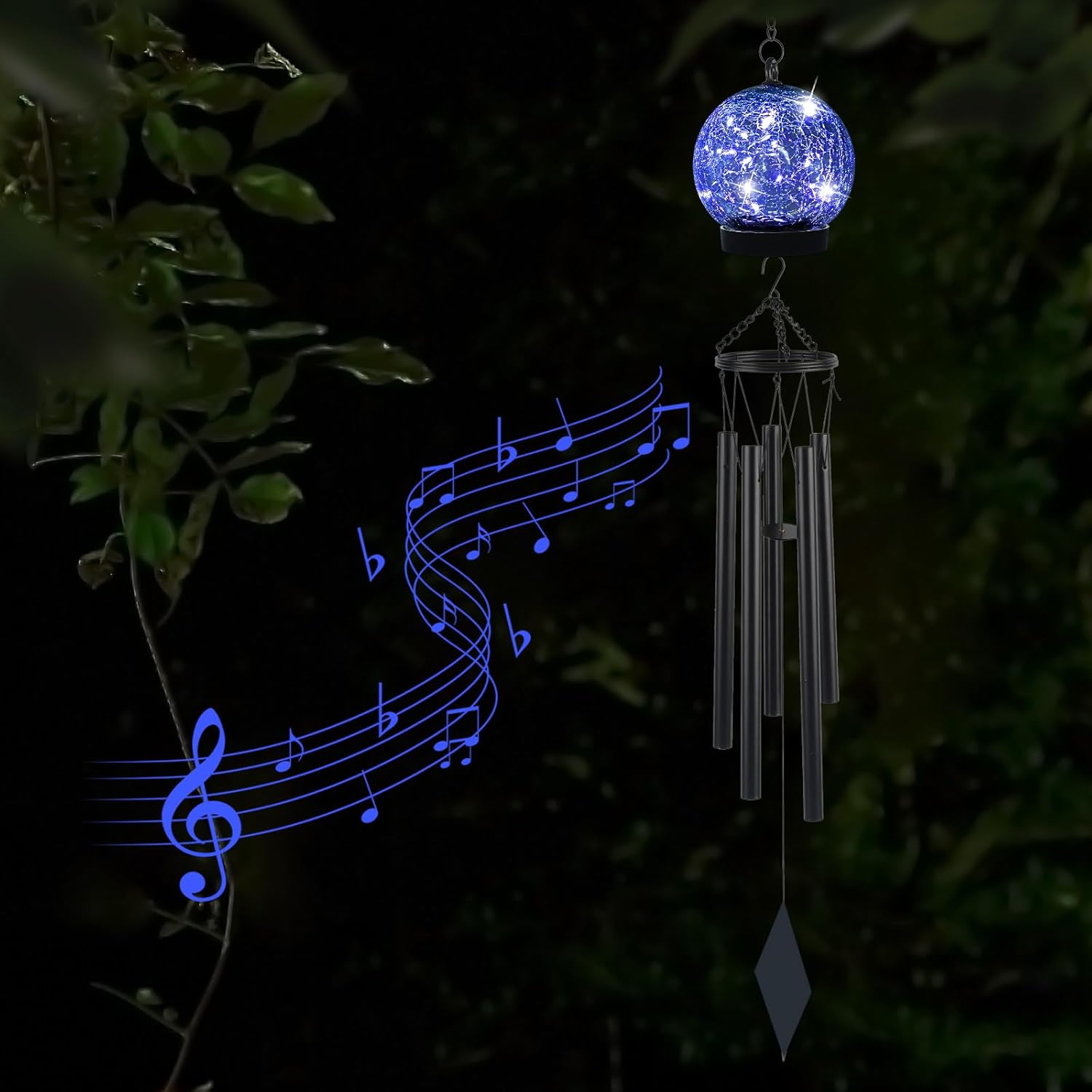 - 【Pretty Garden Décor】: The unique solar wind chimes are designed to add a refreshing and stylish touch to your outdoor. The hanging cracked glass lantern is like a beautiful crystal ball, providing blue light and a romantic atmosphere for your yard. It is not only a hanging wind chime for outside but also a solar garden light decor.