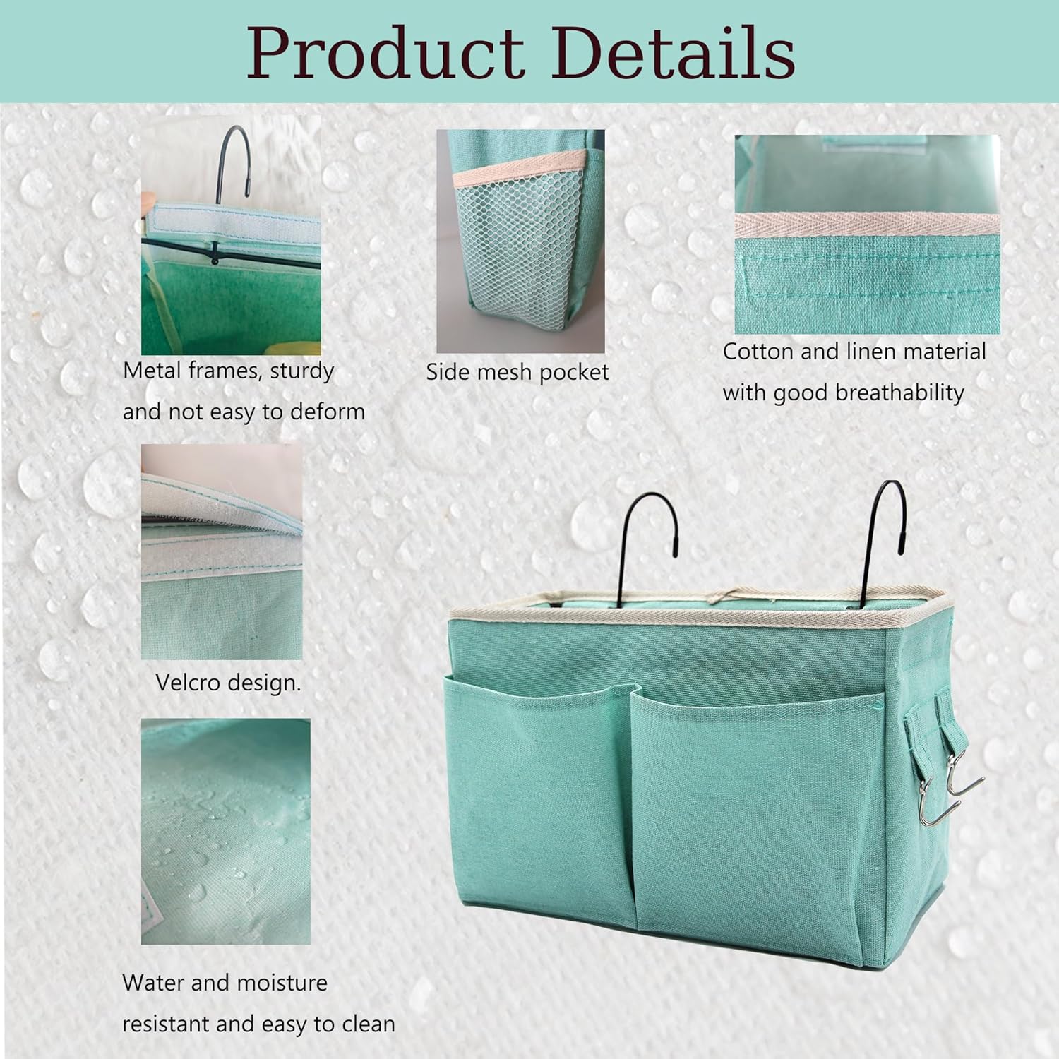 - ă Premium Material ăThe bedside caddy is made of Canvas and iron. make it strong and sturdy.The bedside storage caddy has 1 large pocket, 2 small pockets,1 small mesh pockets,and 2 hook up. You can storage your everything you want on bed, everything is well organized and within reach.