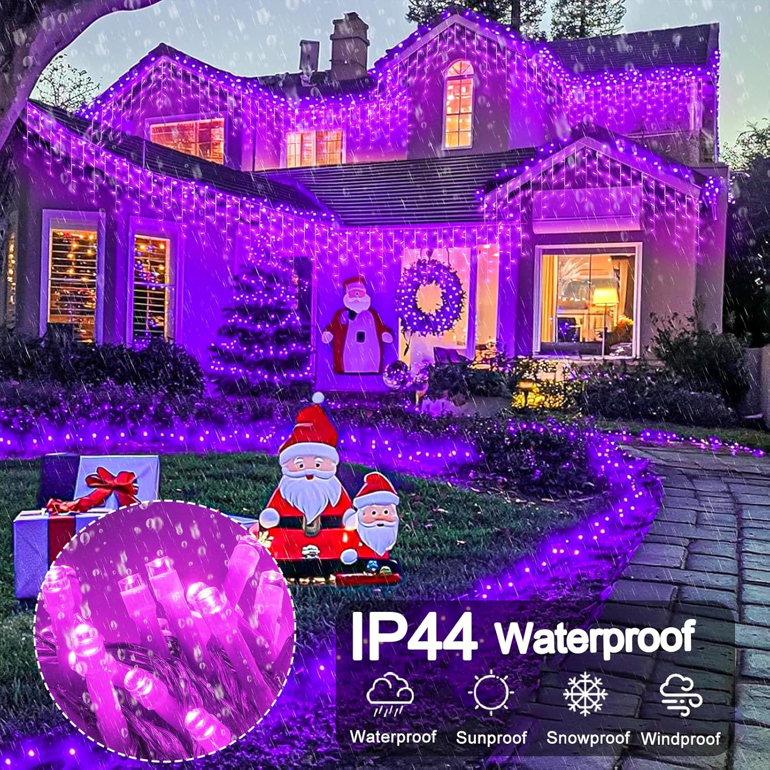 - Connectable Icicle Lights for Outside: 400 pieces LED bulbs 32.8ft light length, each Christmas lights has end-to-end connection that allows up to 3 light strings connected together to meet your different decor needs. 9.84ft lead wire meant no need an extension cord, perfect purple halloween lights for outdoor decoration.