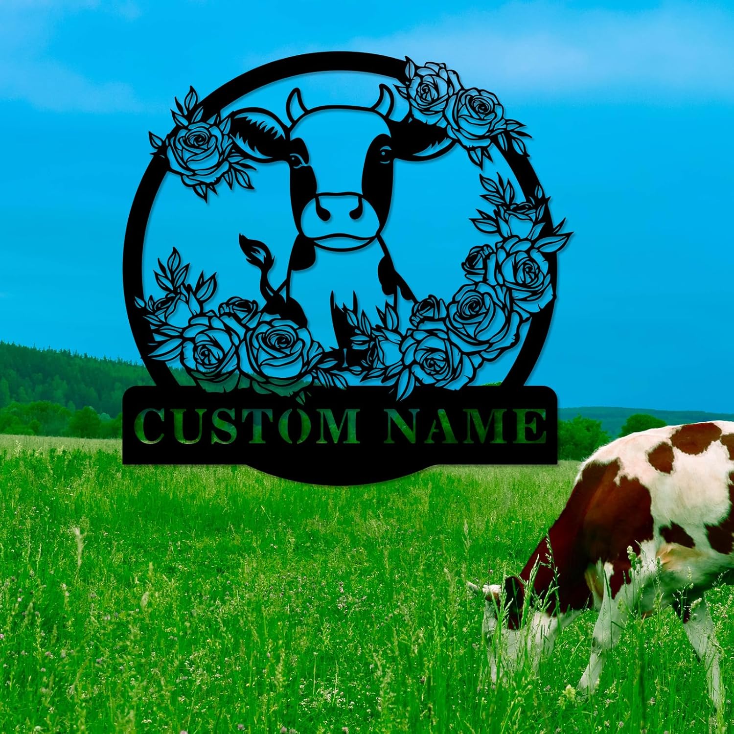 Custom Cow Metal Sign, Personalized Family Name Wall Art, Farm Customized Decor Gifts for Housewarming, Flower Plaque for Farmhouse Bedroom Outside Garden Yard Ranch