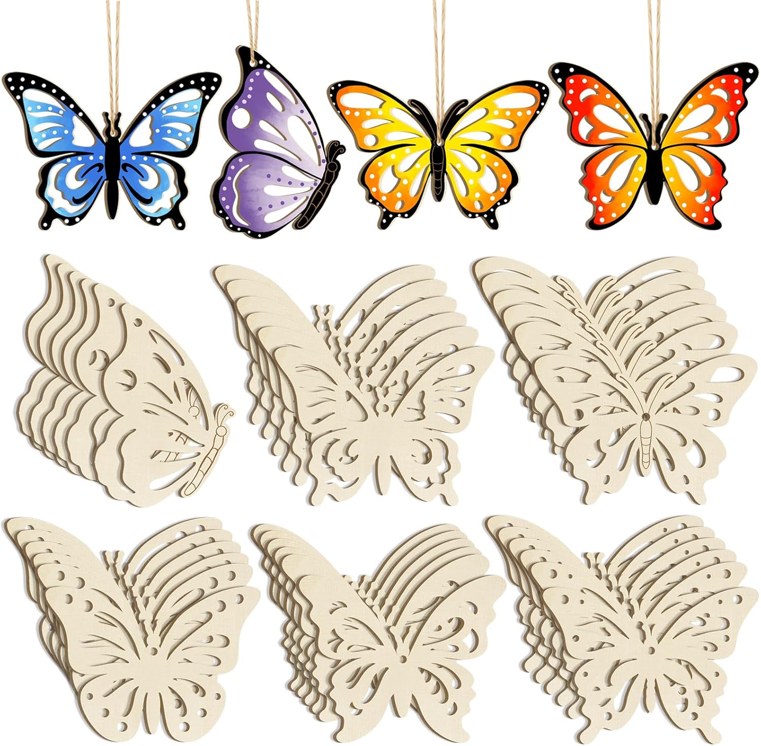 - Package Includes: 6 blank butterfly wooden circles of different shapes for DIY painting, each shape butterfly contains 6 pieces. Comes with 36 braided linen cords.