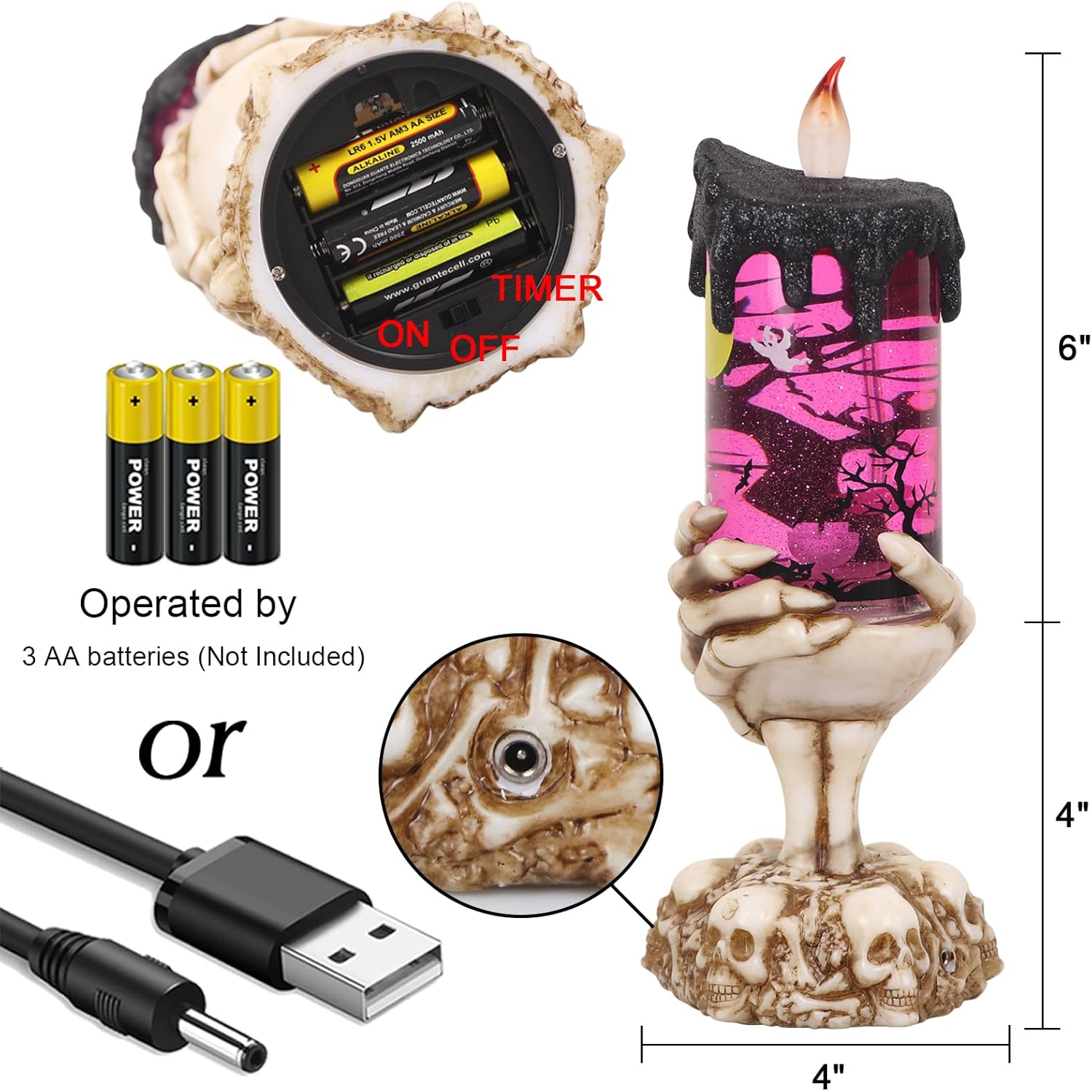 - [6 HOURS TIMER]: Once slide to timer mode, the snow globe candle will light on for 6 hours and off for 18 hours, automatically back to light at the same next day, cycle every 24 hours. A great addition for your Halloween decoration indoor