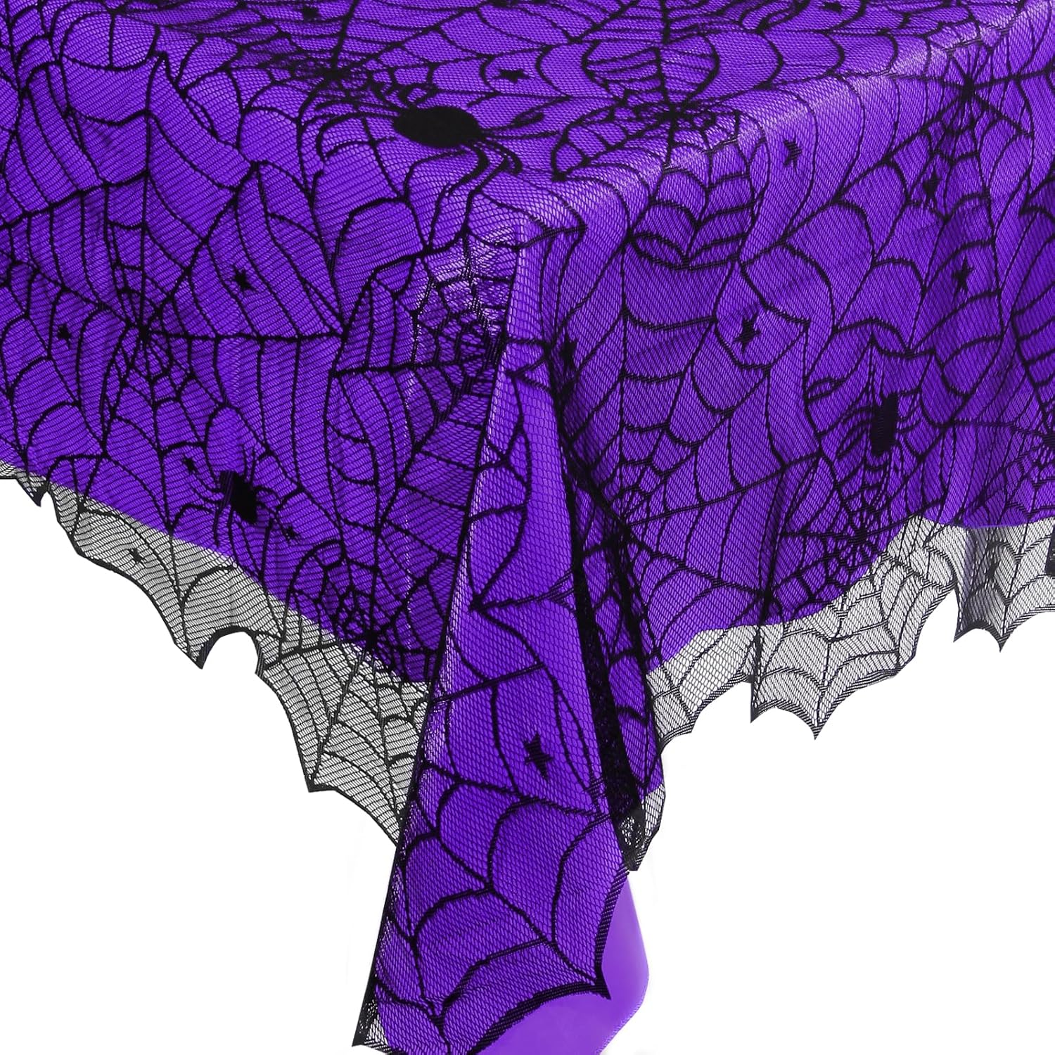 - - Perfect for Halloween: Dress up your Halloween party with this spooky spider web tablecloth. Measures 54 x 72 inches and fits most tables. Color: Black lace & Purple with included Liner.