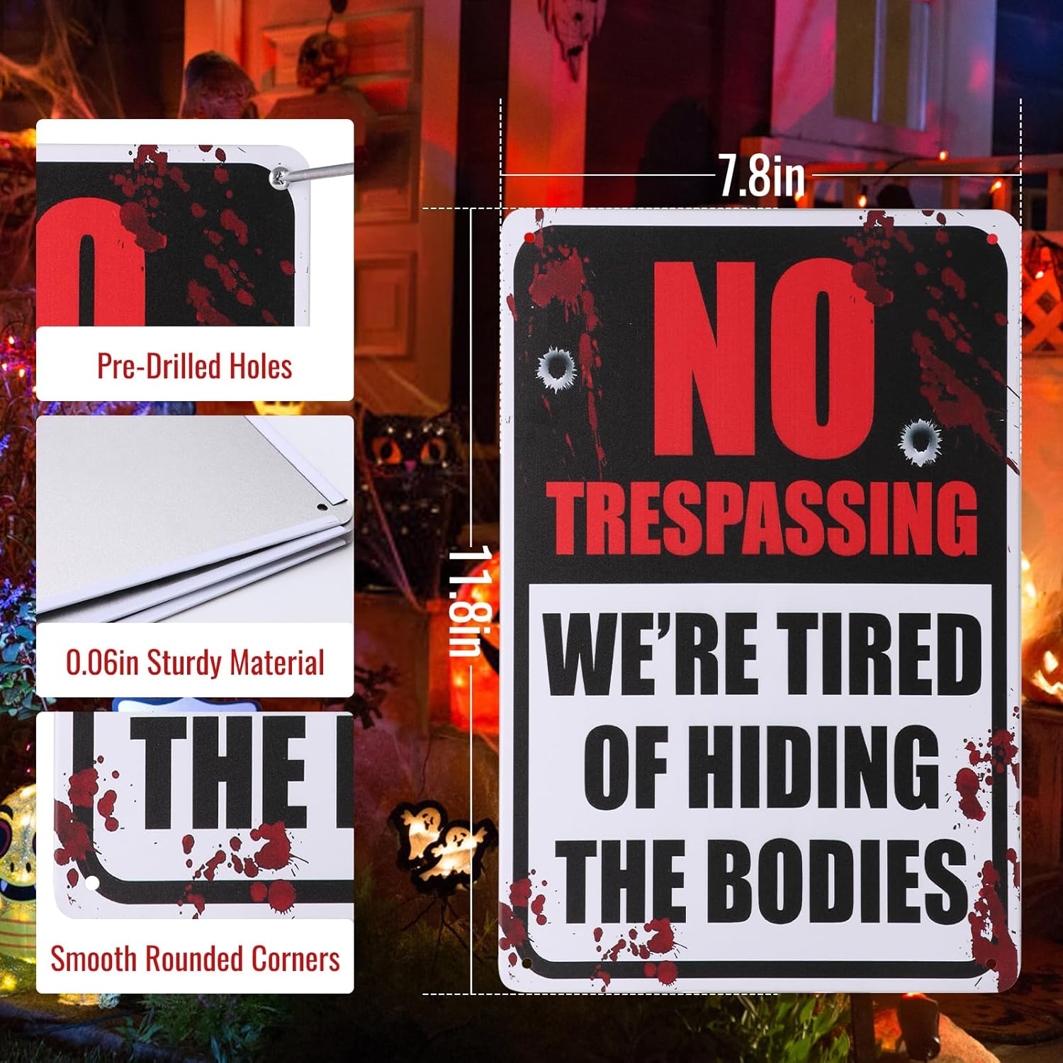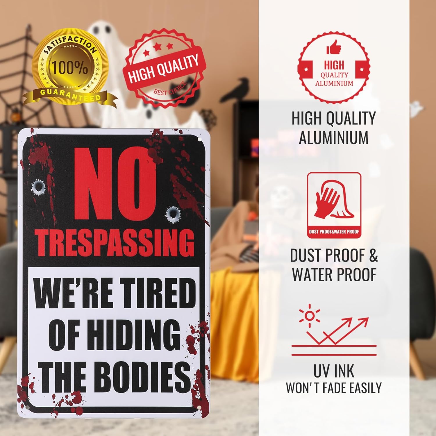 Alotpower Halloween Decorations Metal Tin Sign for Outdoor Yard, Garage Wall, Rustic Vintage No Trespassing We're Tired of Hiding The Bodies, 7.8x11.8in