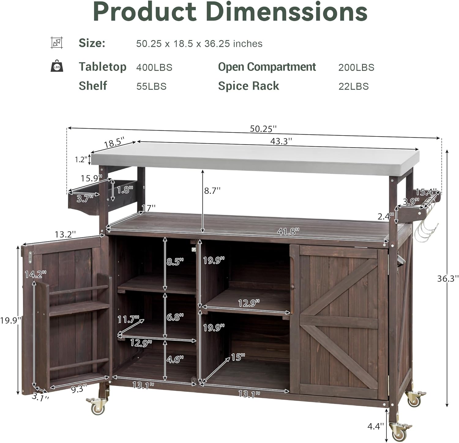 Farmhouse Solid Wood Grill Table with Stainless Steel Top, Outdoor Rolling Bar Cart & Storage Cabinet with Spice & Towel Rack, Outdoor Kitchen Island with Internal Storage Rack, Dark Brown