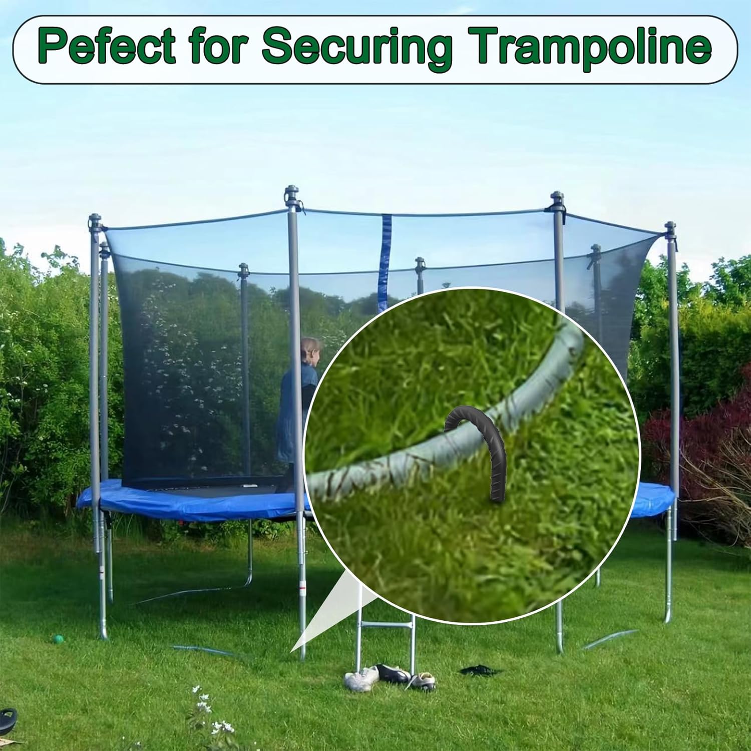 - 【Easy to Install】 No auxiliary tools required. The chisel pointed end makes the trampoline stakes penetrate into soil and hard surfaces easily. You can step on it to make the rebar stake penetrate deeper into the ground. The rebar surface provides strength to hold it in place and can stabilize anything on a windy, rainy day