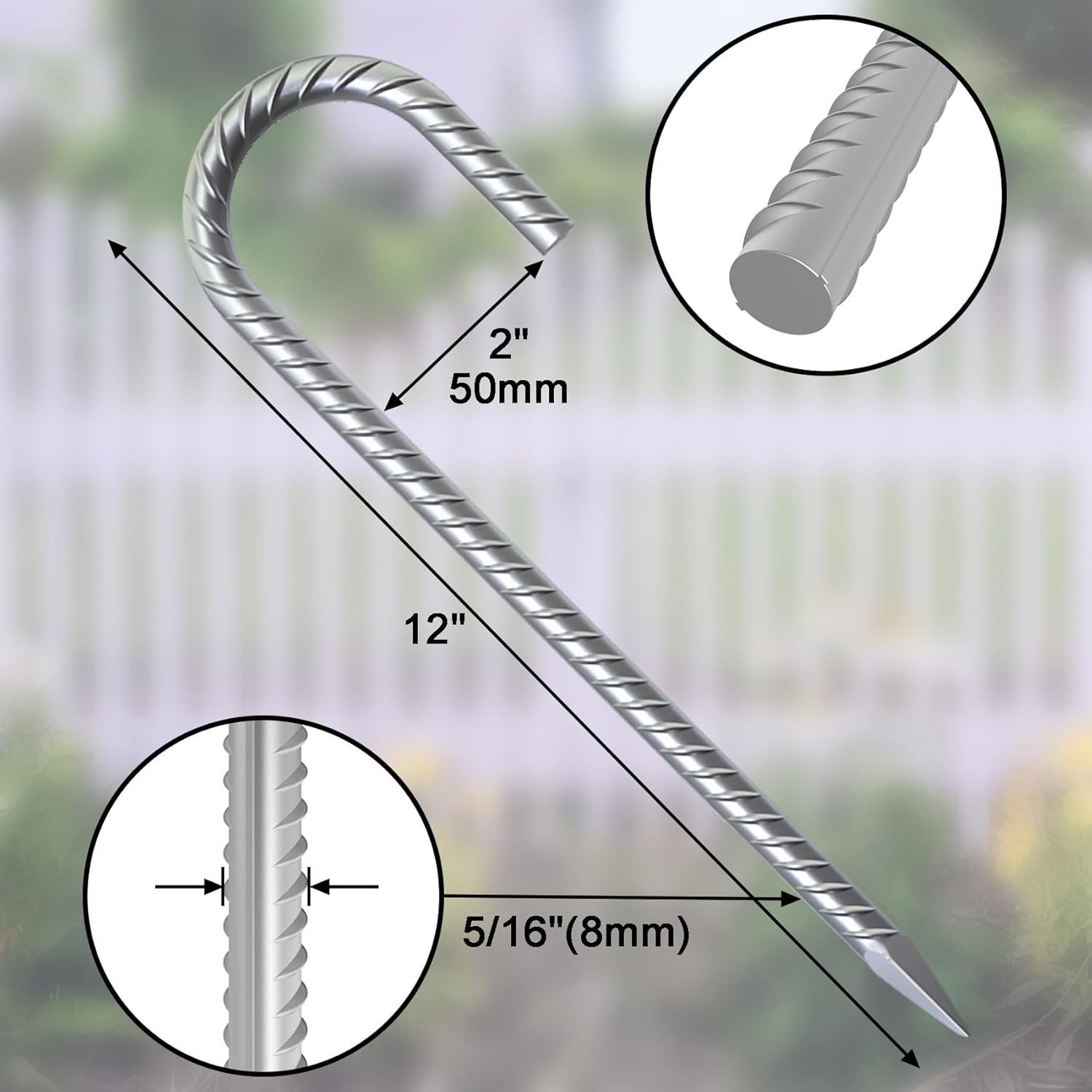 - Heavy Duty Rebar Stakes: Sold in bundles of 55, each 12-inch stake features a 5/16-inch (8mm) diameter J-hook design with 2-inch hook spacing. Perfect for securing chain link fences, outdoor decorations, greenhouses, canopies, gazebos, large inflatables, and more