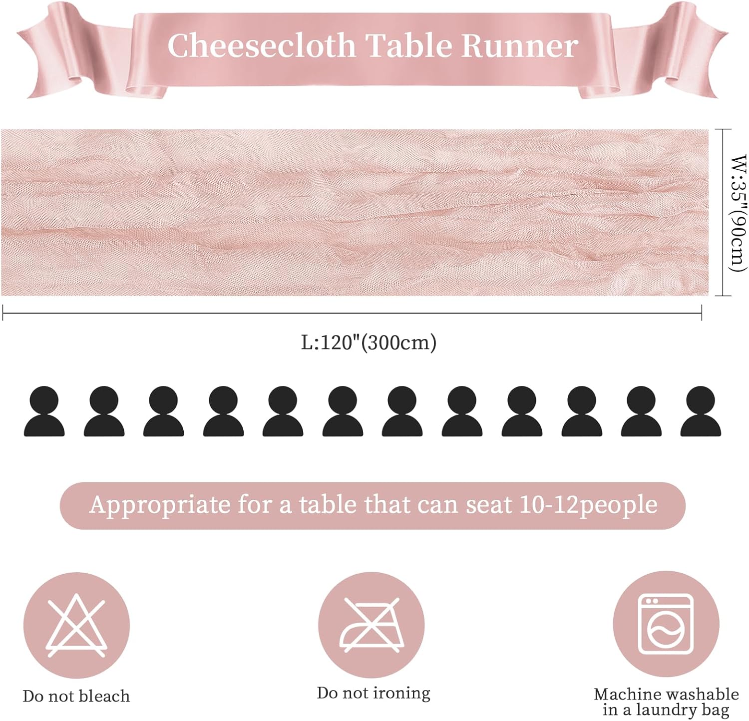 - PACKAGE INCLUDED: You will receive 6PCS dusty pink cheesecloth table runner. Elegant and beautiful design, exquisite workmanship. Product size: Each boho table runner is 35 x 120 inches. Enough to cover rectangles and round tables, as well as long tables that are stitched together. It can even be used to belt chairs or decorate table scarf, background curtains or even gift wrap. Round or square tables for 8-10 people, perfect for romantic and elegant party events