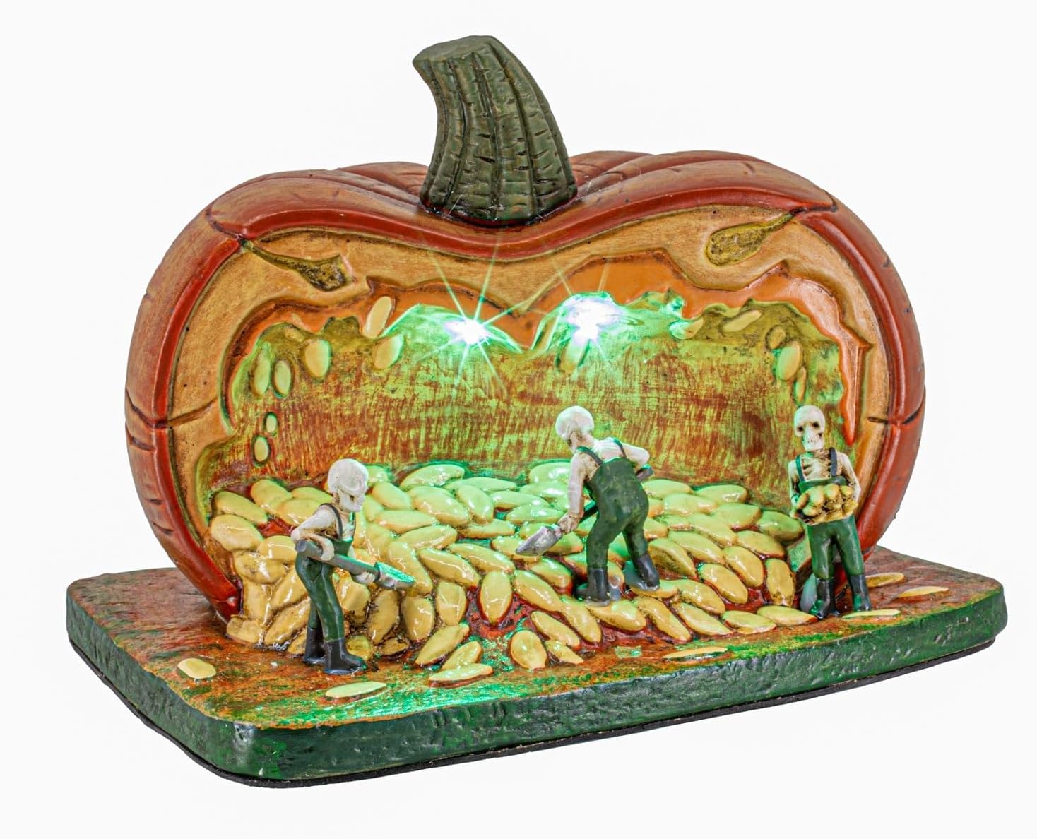 - [Eerie Elegance] Spooktacular porcelain village features skeletons gathering gourds from a giant pumpkin, all bathed in colorful LED lights for a hauntingly beautiful ambiance.