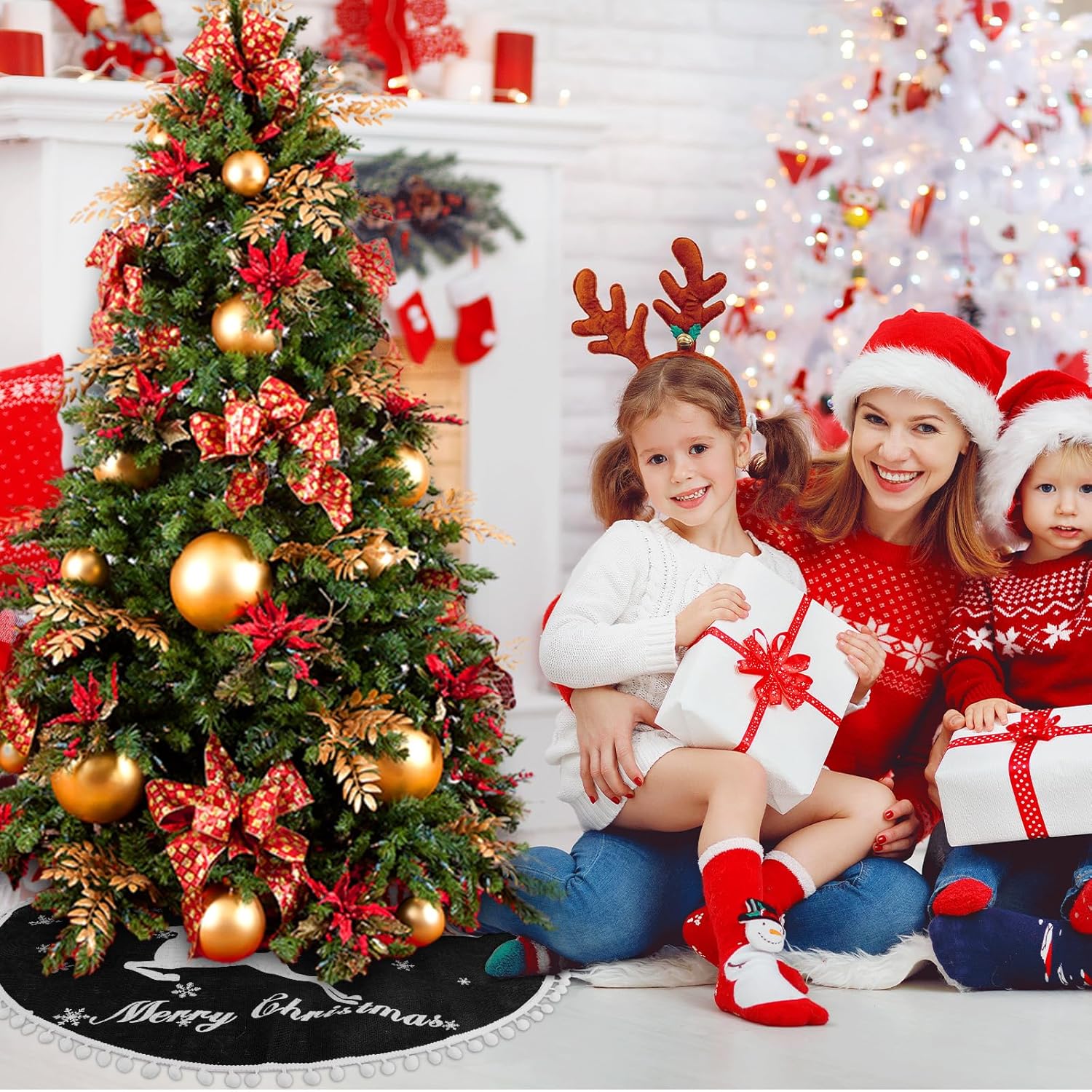 - Merry Christmas Tree Skirt:Our Christmas tree skirts is printed with elk and various sizes of snow patterns, as well as the words "Merry Christmas." The edges are adorned with small, fluffy balls, adding a festive touch to your Christmas tree. This 30-inch tree skirt is perfectly sized for most Christmas trees perfectly. Before making a purchase, please measure the diameter of your tree to ensure a perfect fit