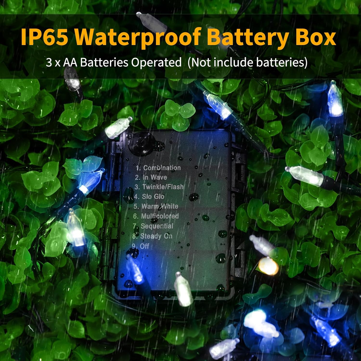 - ăManual operationăThere is 8 various fantastic lighting effects adapting to desired occasions or events: press the button on control box repeatedly to select 1.combination, 2.in wave, 3.sequential, 4.slow glow, 5.chasing or flash, 6.slow fade, 7.twinkle or flash or 8.steady on