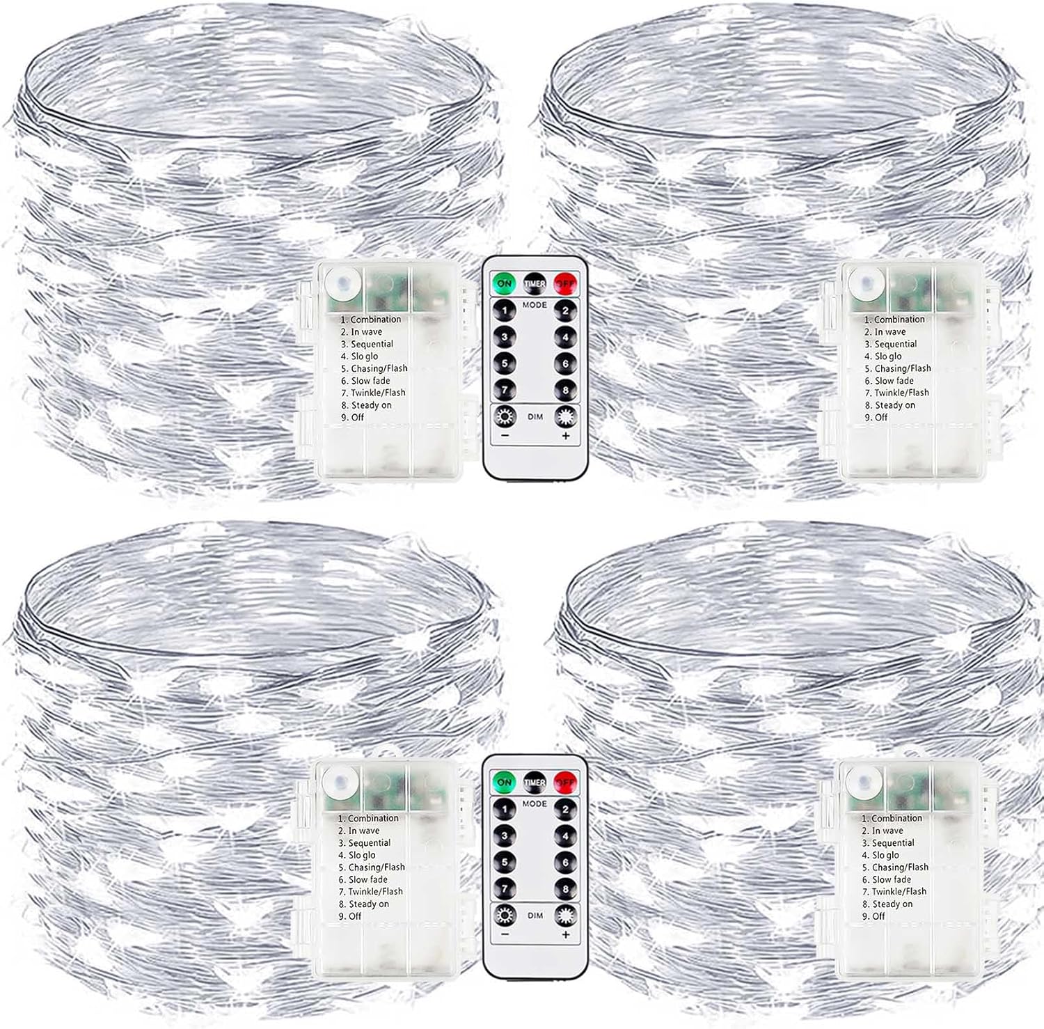 4-Pack Fairy Lights Battery Operated with Remote, Waterproof 33FT 100 LED Battery String Lights Outdoor Indoor, 8 Modes Twinkle Lights with Timer for DIY Home Centerpiece Christmas Decor (Cool White)