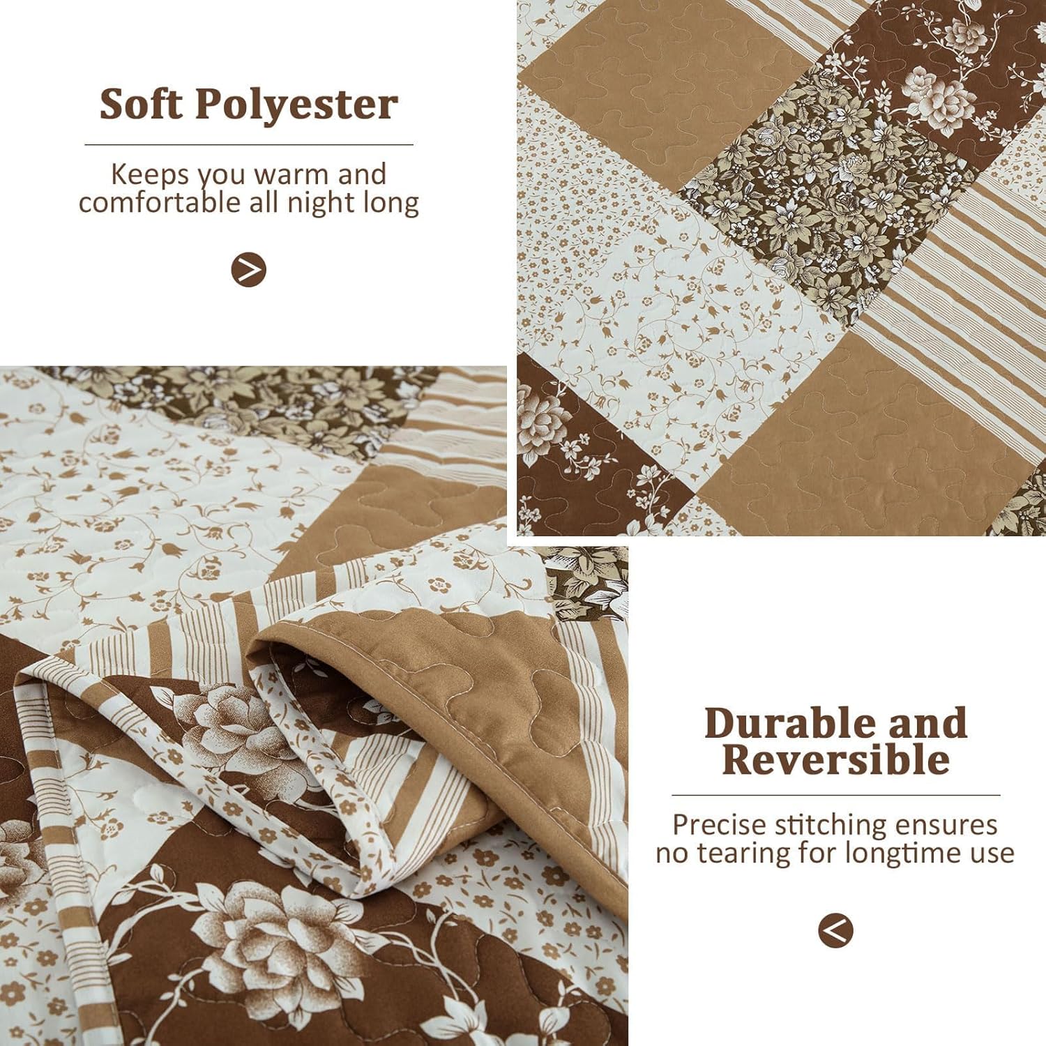 Dobuyly Fall Quilt Queen Size, Brown Floral Plaid Patchwork Bedspread Fall Bedding Set, Soft Lightweight Microfiber Coverlet Set for All Season (1 Quilt, 2 Pillow Shams)