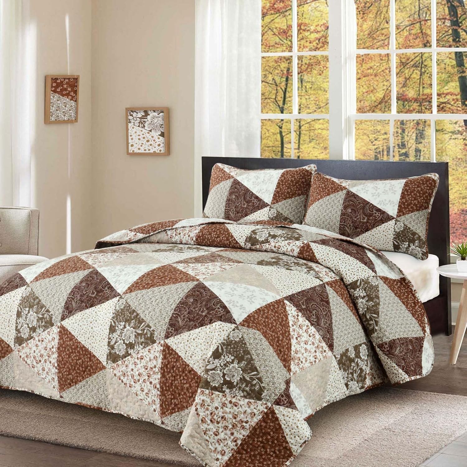 Dobuyly Fall Quilt Queen Size, Brown Floral Triangle Patchwork Bedspread Fall Bedding Set, Soft Lightweight Microfiber Coverlet Set (1 Quilt, 2 Pillow Shams)