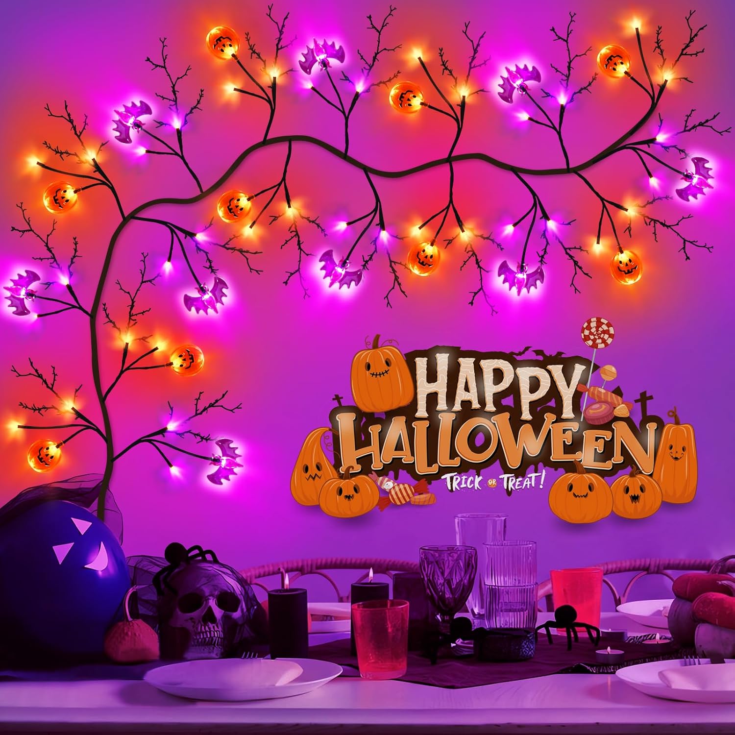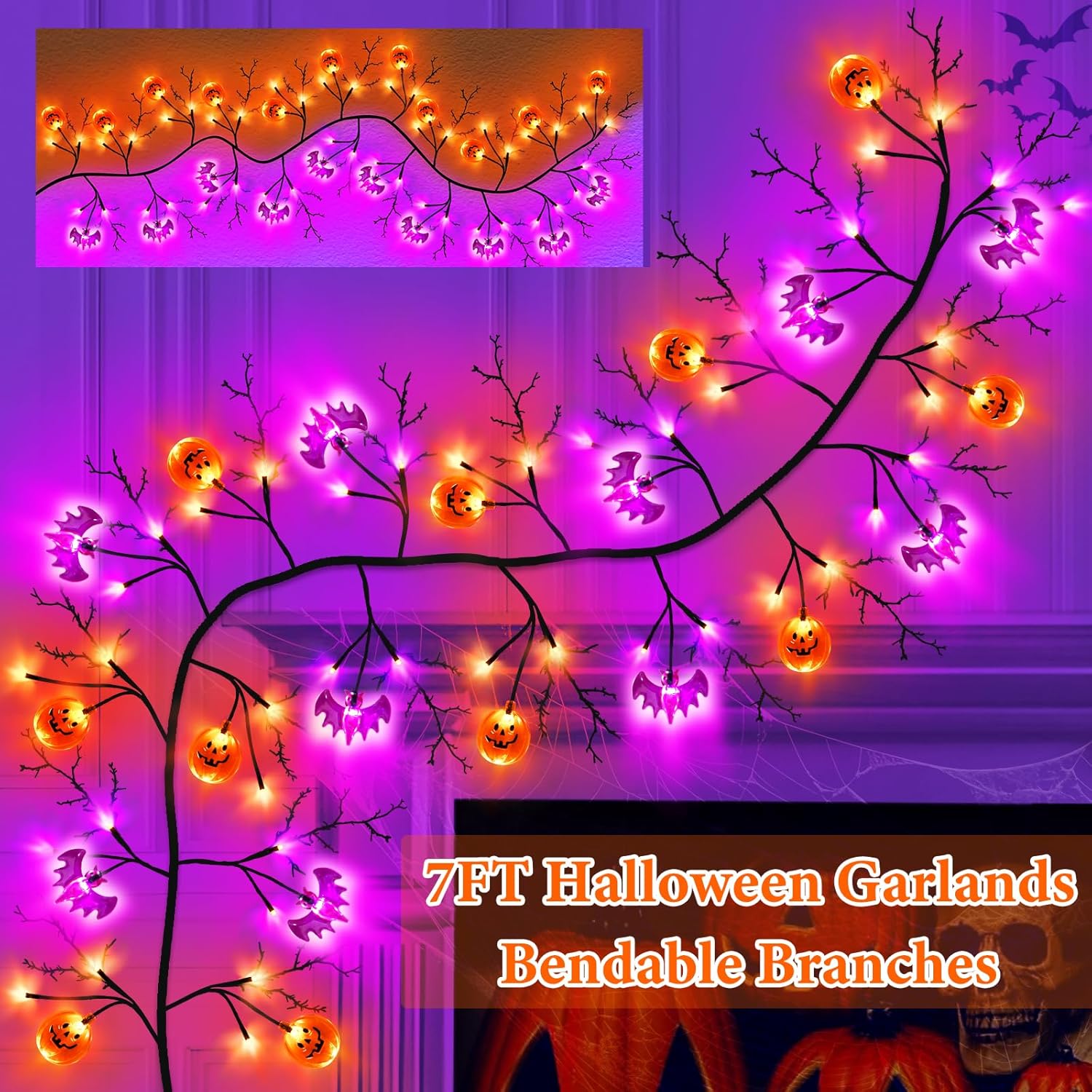 - 【Halloween Garland Decorations】You will receive 7 Feet Long Realistic Halloween garland with 63 LED lights ,Includes 11 pcs orange pumpkins and 10 pcs purple bats,The black Vine Twigs can present a mysterious atmosphere, Ideal for Fall Halloween indoor outdoor decor