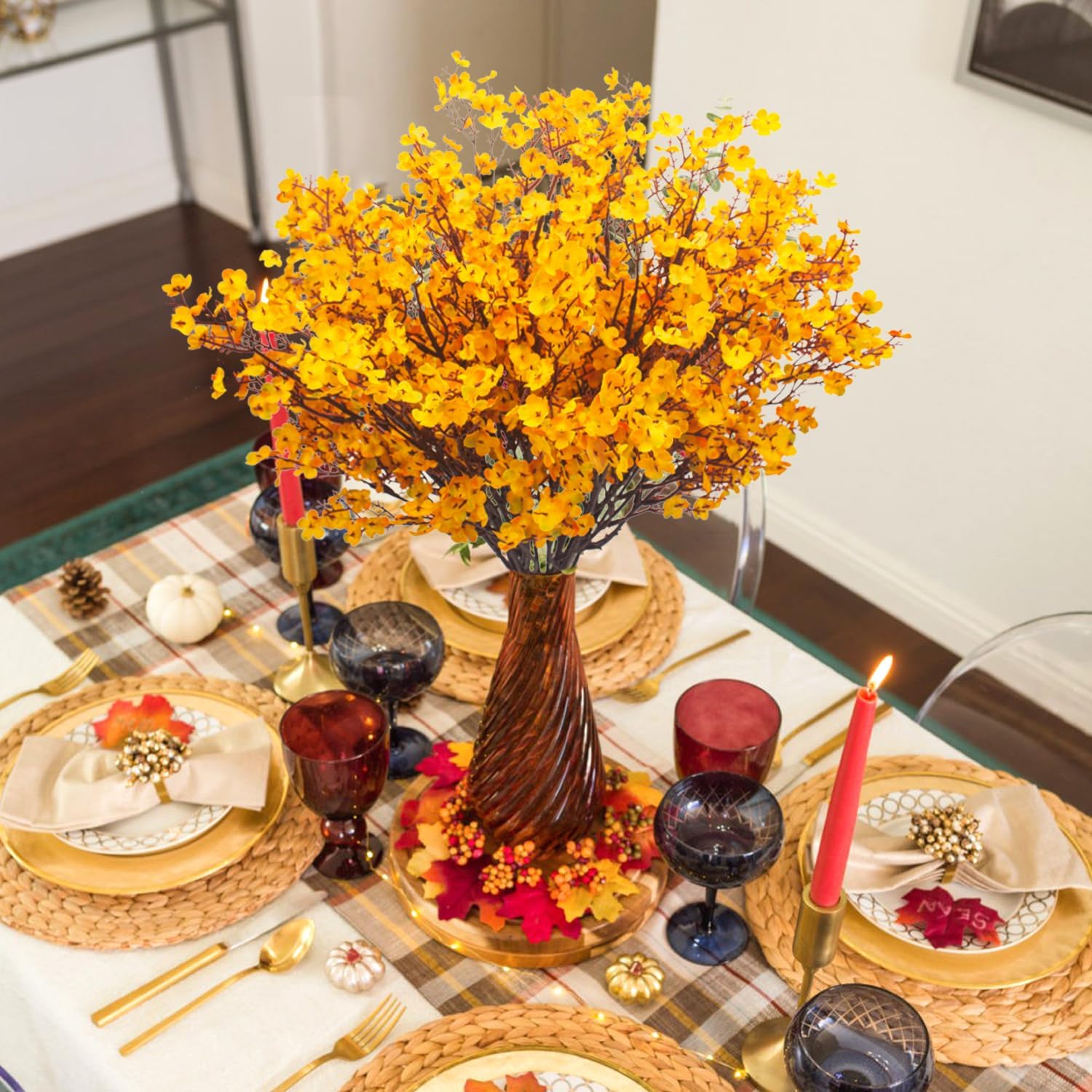 10Pcs Artificial Babys Breath Flowers, Orange Fall Flowers, Fake Silk Flowers for Home DIY Floral Arrangement Table Centerpiece Fall Thanksgiving Autumn Decoration