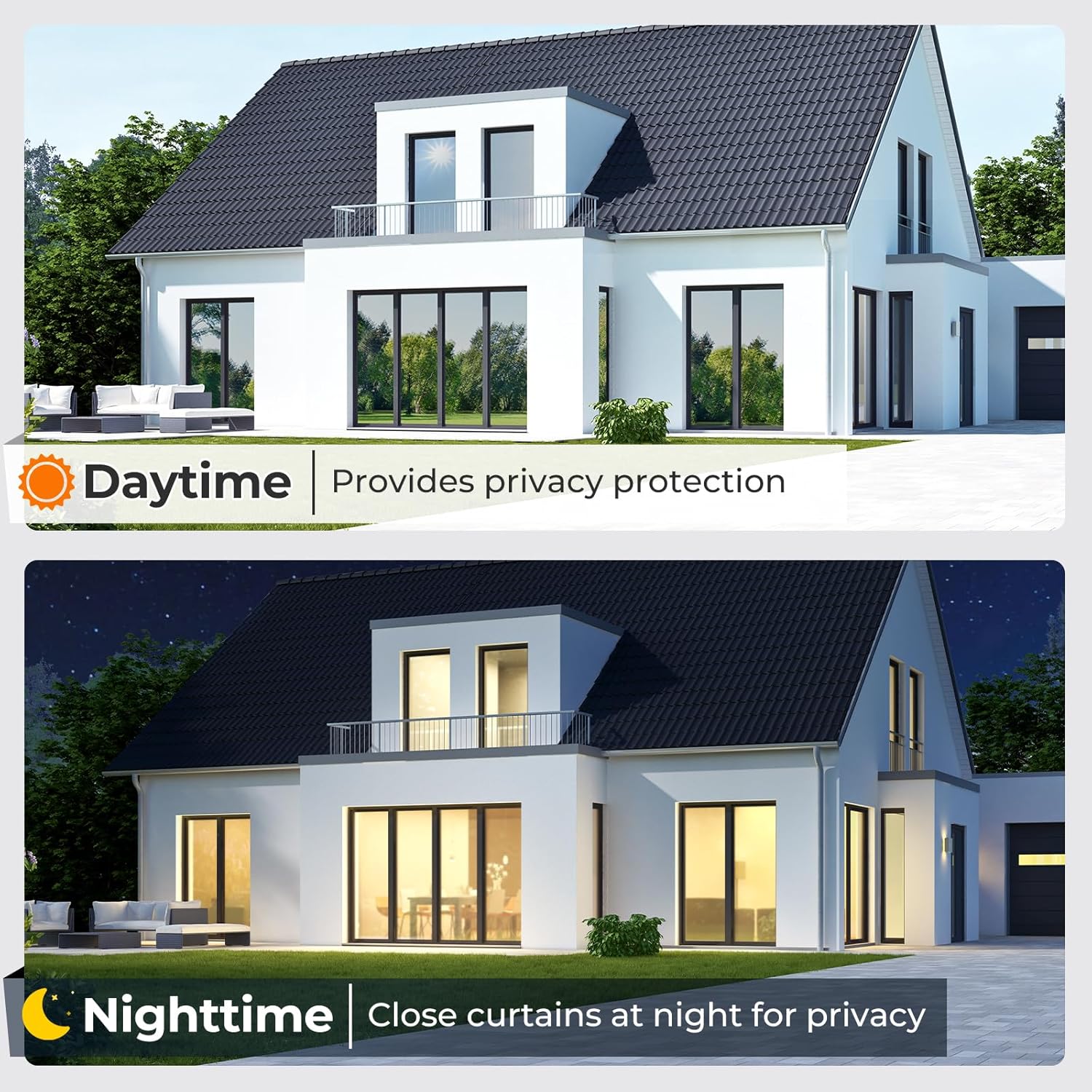 - Daytime Privacy, Mirror Effect: When the outside light is stronger, our one way privacy window film creates a mirror-like effect on the outside, providing daytime privacy while still allowing you to see out. However, at night, the privacy may be reduced. It's recommended to use curtains during the night