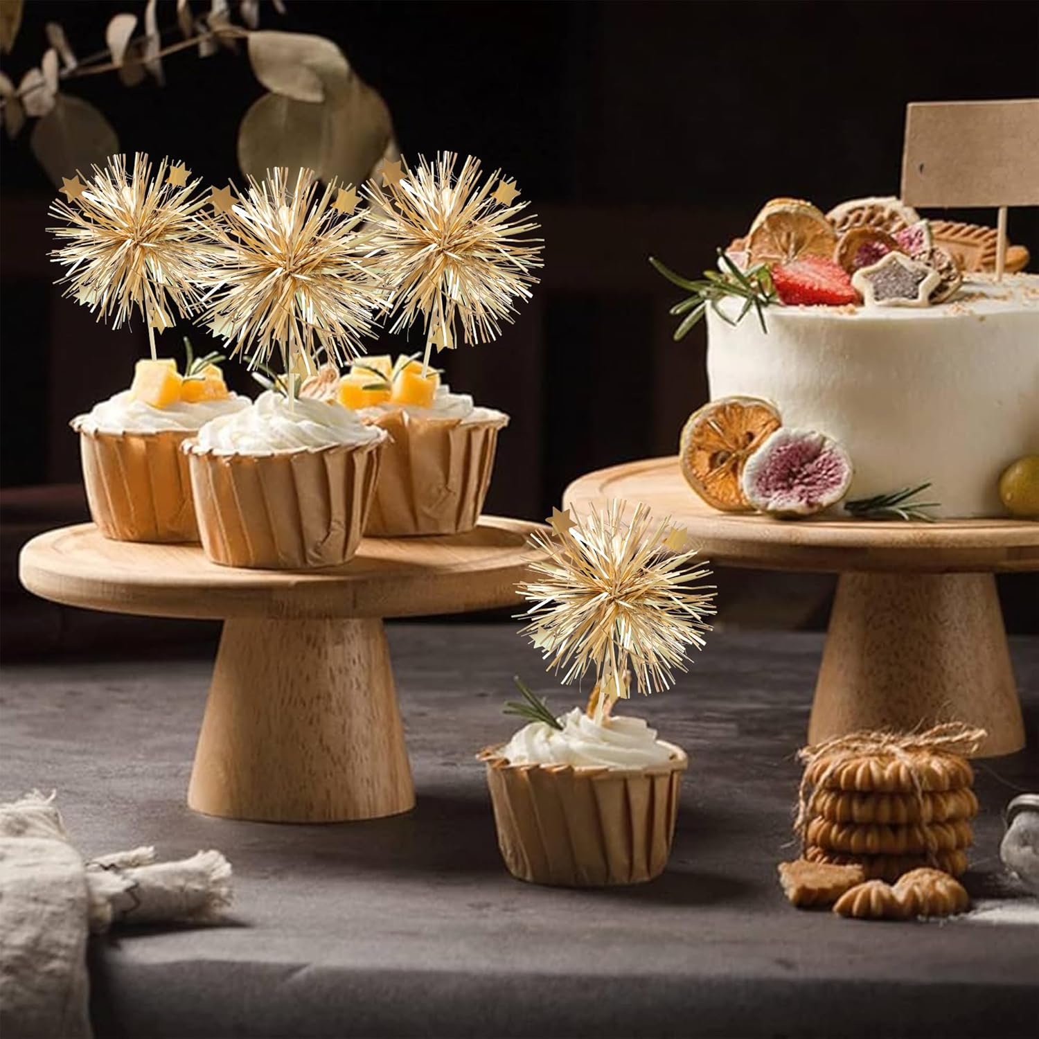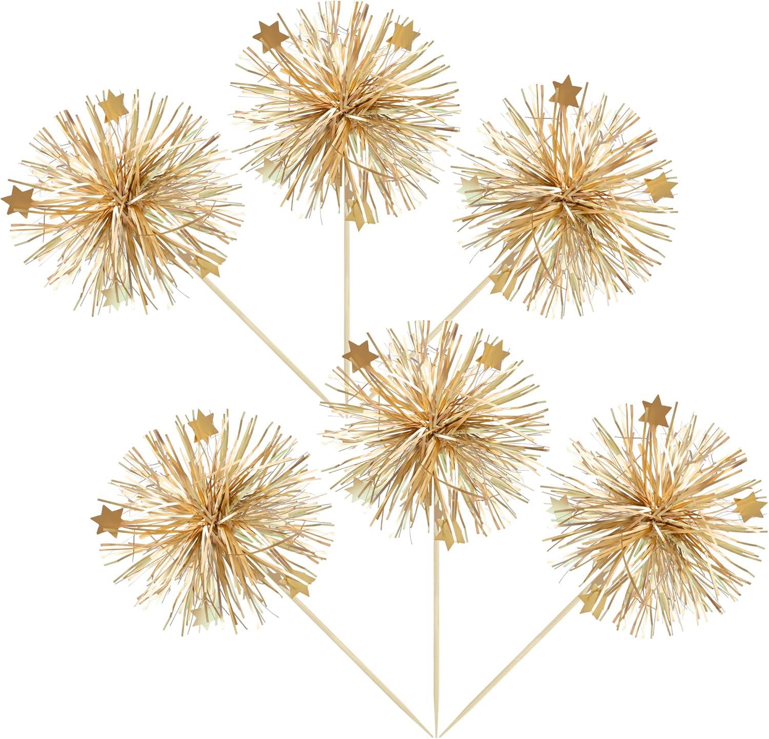 Ephlyn 30Pcs Foil Firework Cupcake Toppers Party Birthday Cake Toppers Supplies Sparkle Tinsel Cocktail Fruit Toothpick for Birthday Wedding Graduation Party Supplies Gold