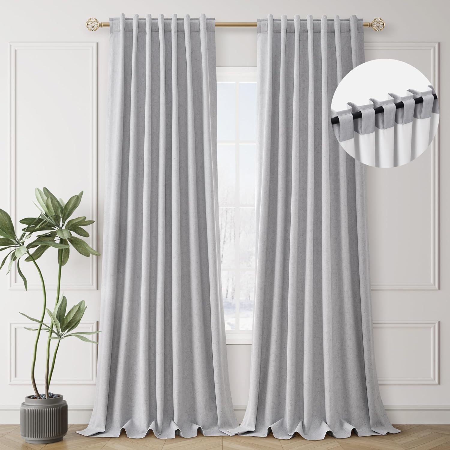 Grey Blackout Curtains Linen Room Darkening 96 Inch Long for Bedroom Living Room 2 Panels Set Back Tab 100% Black Out Curtains Light Gray Modern Linen Blended Thermal Insulated Drapes Heat Blocking