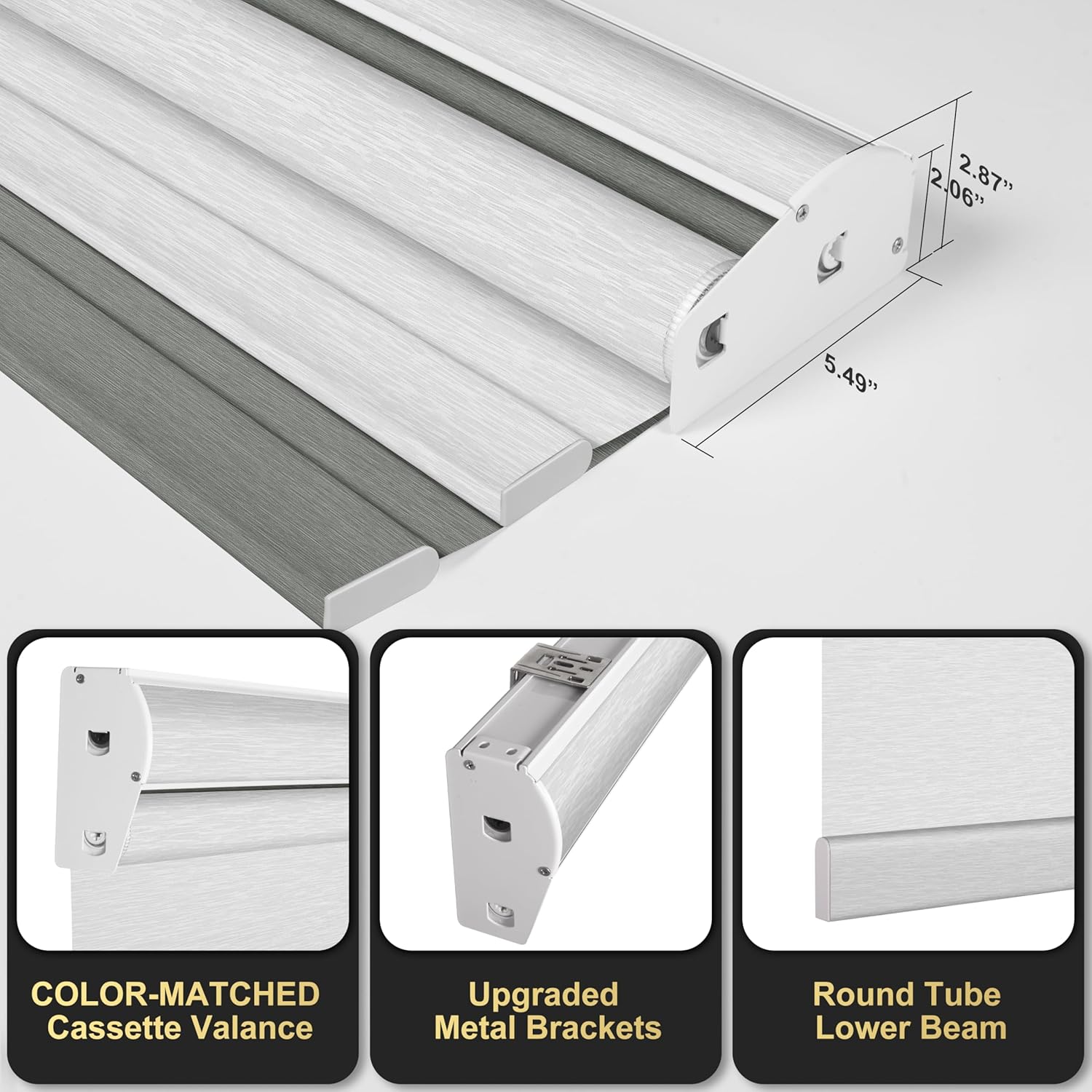 - FREE STOP CORDLESS SYSTEMļ¼The cordless double roller shade prioritizes safety with a cordless design designed for families with small children or pets.You just need to pull down or push up to stop at any position you want. COLOR-MATCHED CASSETTE VALANCEļ¼The hidden installation of the cordless roller blinds can effectively reduce installation gaps, reduce light leakage.The color of the cassette valance is same as the fabric color,making the day night blinds more beautiful after installation.
