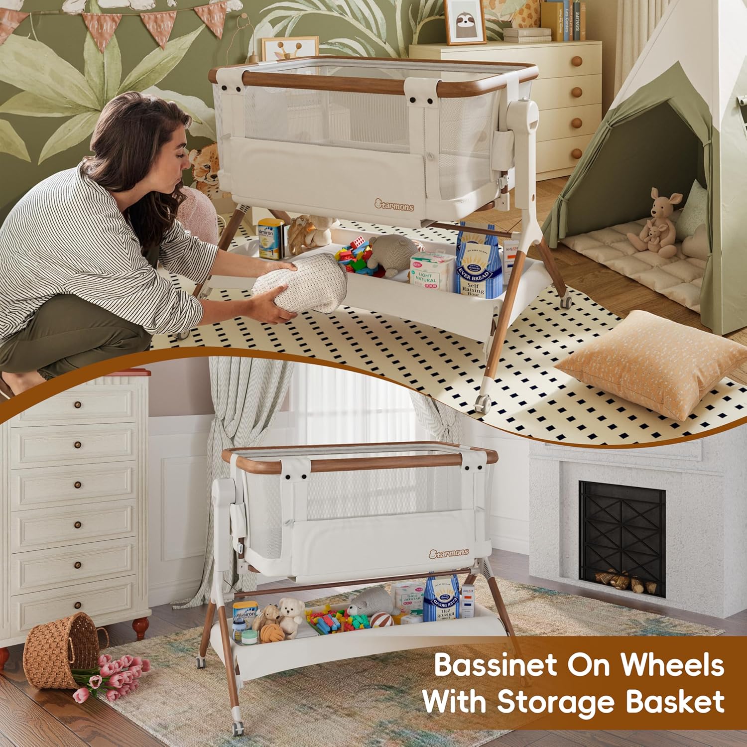 - SAFETY STRAPS AND LOCKABLE WHEELS:This bassinet bedside sleeper features safety straps for secure attachment to an adult bed and 360-degree rotating wheels for easy room-to-room movement, also serving as a standalone bassinet for versatile use as your child grows.