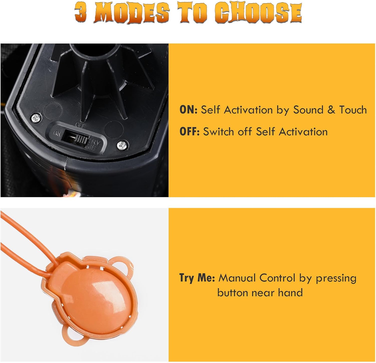 - 3 Modes to Choose - Comes with a battery compartment providing 3-mode control including OFF, Self-Activate Mode and Try Me Mode, you can press the button near the ghost's hand to activate it manually under Try Me Mode, or switch to ON to enable sound & touch activation mode