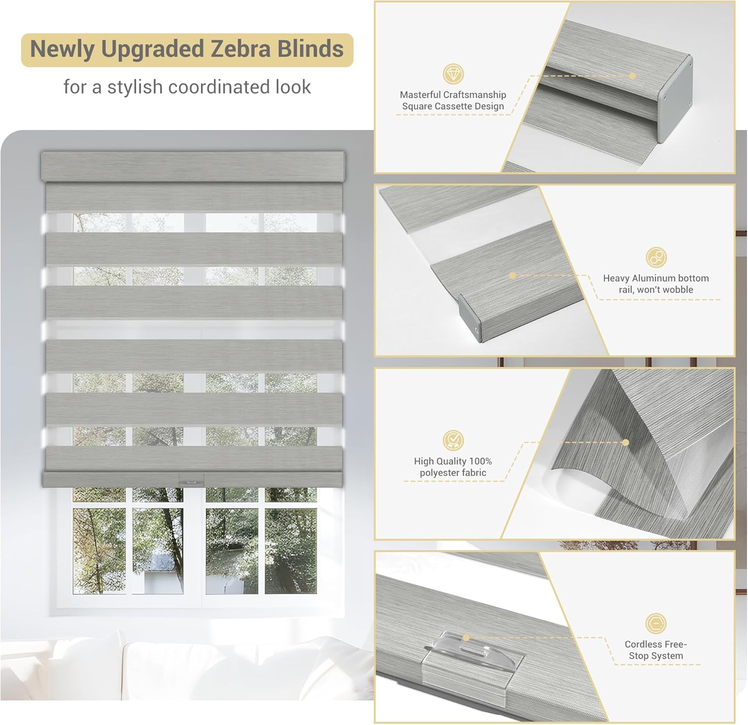 - 【Upgrade High-Quality Accessories】Our blind has been upgraded to have a sturdier bottom rail to prevent the fabric from fraying, which makes the two layers of fabrics more closely fit, maximizing the effect of shading. An anti-collision strip installed under the rail for protecting your window frame. Color-matched valance and the aluminum bottom bar suitable for all situations.