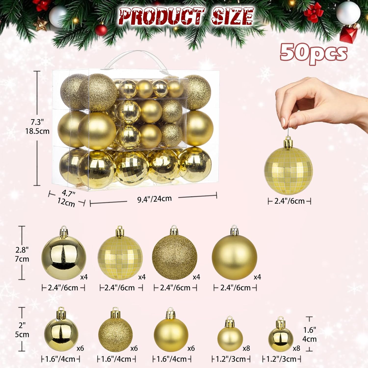 - Christmas Ball Ornament Size: The 50Piece christmas ball ornament set includes 16 small balls (1.18", 3cm), 18 medium balls(1.57",4cm), and 16 large balls (2.36",6cm), Perfect to decorate a whole normal size christmas tree. Tree balls with light weight and won't weigh down the Christmas tree branches. Exquisite tree baubles that create stunning Christmas theme and add stronger festive atmosphere