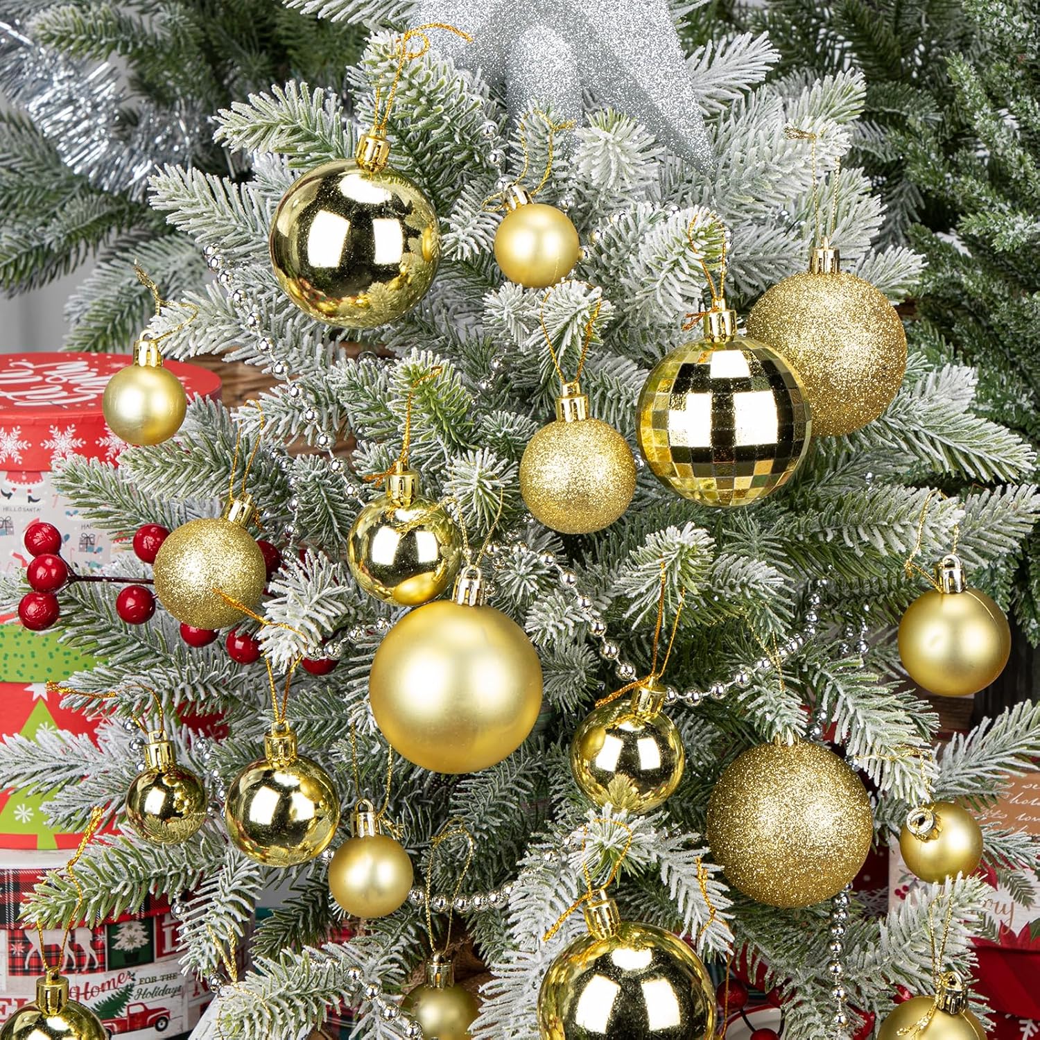 - Easy to Use: Each hanging gold Christmas ball ornament equips a hook with string for you to hang it easily. Perfect fit for any normal size tree, give yourself a perfect space, hang anywhere you like. Such as tree branches, gate, fence, banister, etc. Create a warm and harmonious atmosphere