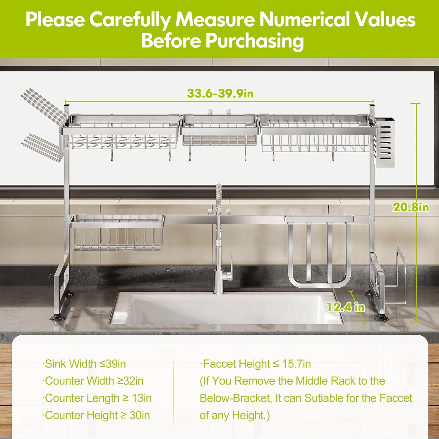 - Fit for the Faucet of Any Height: If you remove the middle rack to the below-bracket, this sink drying rack can suitable for the faucet of any Height. Beside, the size is 33.6 - 39.99 (L) *12.4 (W)*20.8(H) inches.