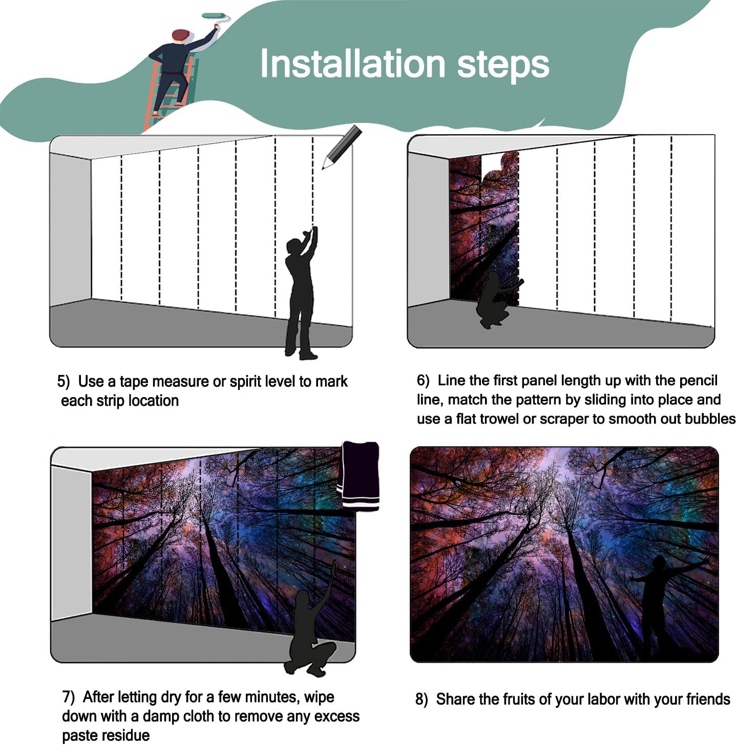 - Mural wallpaper size: 100 "W x 65 "H, divided into 5 sections, each section is labeled with a number underneath, there is no need to overlap the pattern when installing, just install according to the number labeled underneath the panel