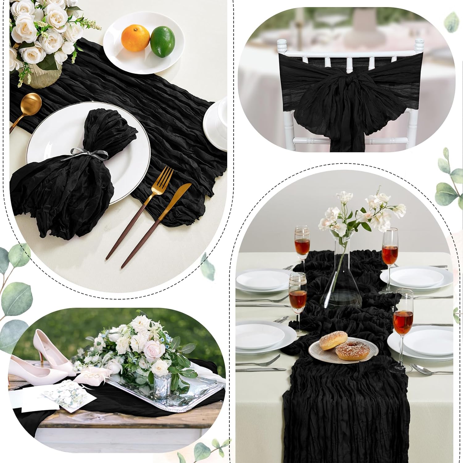 - âżăPREMIUM MATERIALăThe cheesecloth table runner is made of high-quality polyester. Carefully sewn, delicate edge, not easy to lose thread, not easy to decolorize, lightweight and skin-friendly, can be cut into any length and shape. High-quality fabrics hang on banquet tables to add a romantic, sophisticated and fluid atmosphere and can be paired with flowers, candlesticks, greenery and other decorations to impress guests.