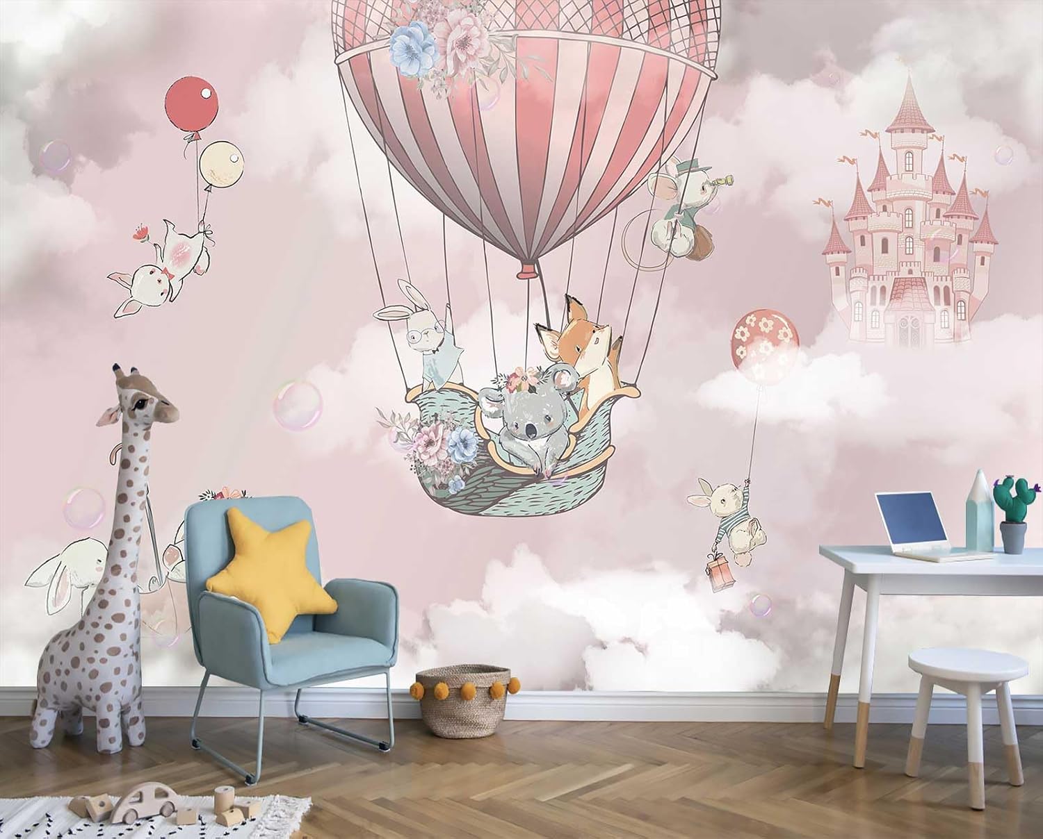 Animal Castle hot air Balloon Pink Wallpaper for Girls Room Wall Decoration Mural(Not Peel and Stick)