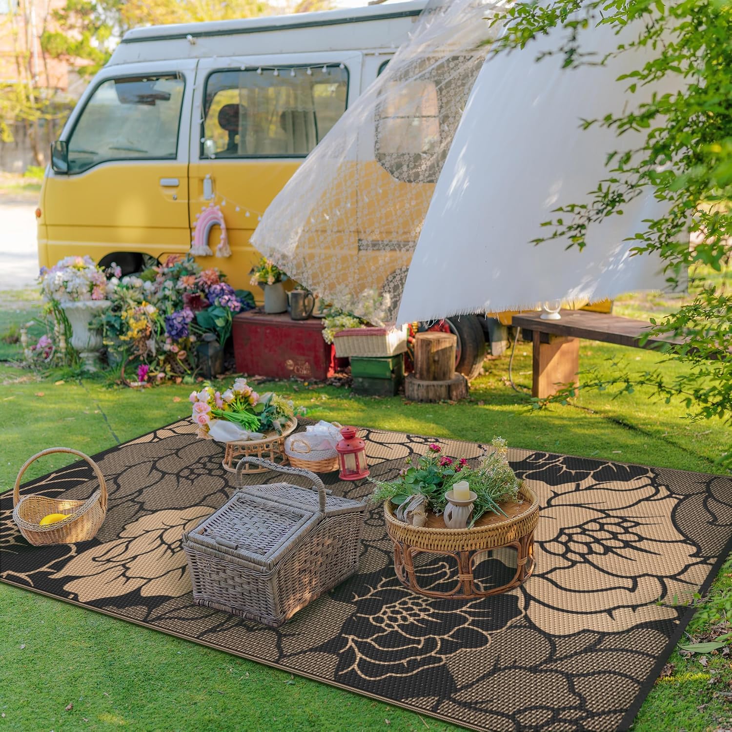 - Perfect Choice For RV Camping: Woven from lightweight plastic straws, these RV outdoor rugs can be easily folded down to a compact size to fit in our included carry bag. This portable waterproof outdoor rug allows you to take it outside easily, and also designed 4 corner loops with 4 stakes to help fix the carpet in place. Using this camper rug will relieve all the burden and fatigue of your RV trips and camping, allowing you to have plenty of imaginable space for more fun