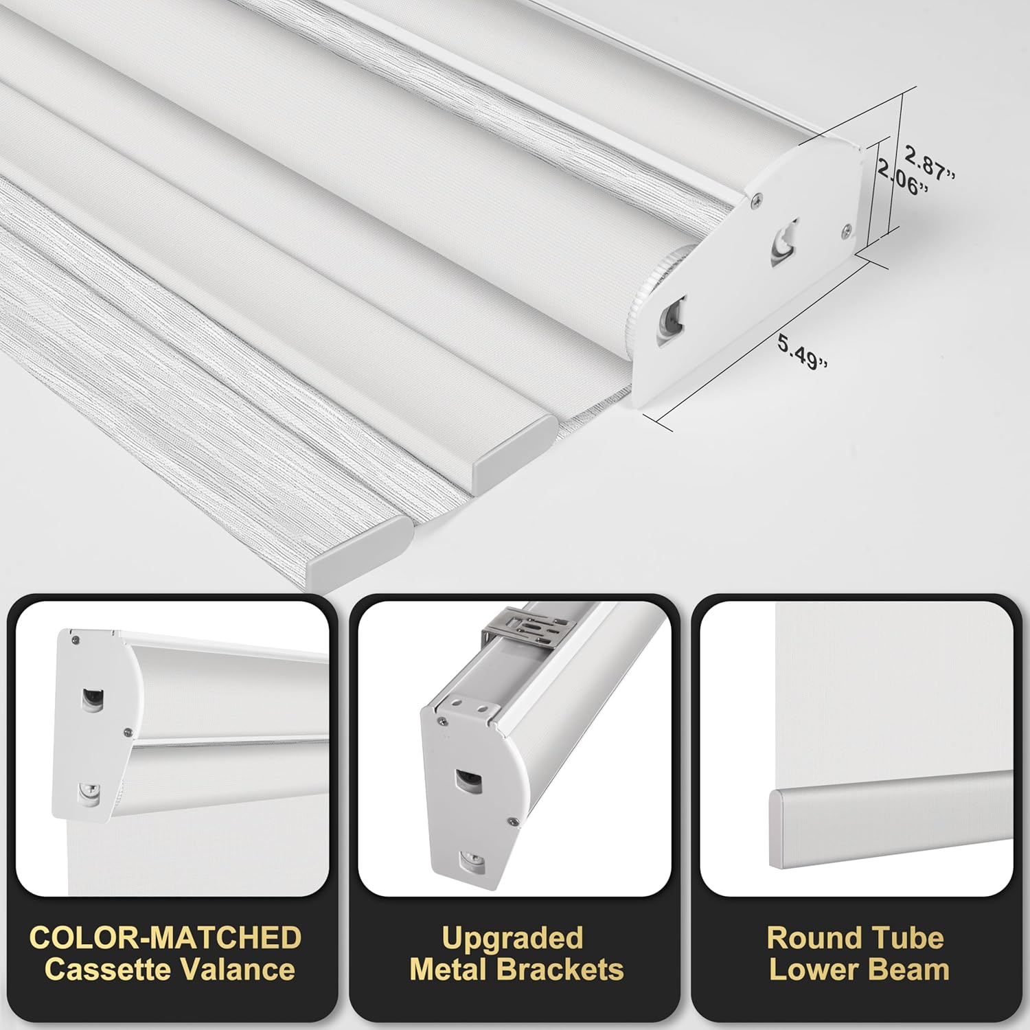- FREE STOP CORDLESS SYSTEMļ¼The cordless double roller shade prioritizes safety with a cordless design designed for families with small children or pets.You just need to pull down or push up to stop at any position you want. COLOR-MATCHED CASSETTE VALANCEļ¼The hidden installation of the cordless roller blinds can effectively reduce installation gaps, reduce light leakage.The color of the cassette valance is same as the fabric color,making the day night blinds more beautiful after installation.
