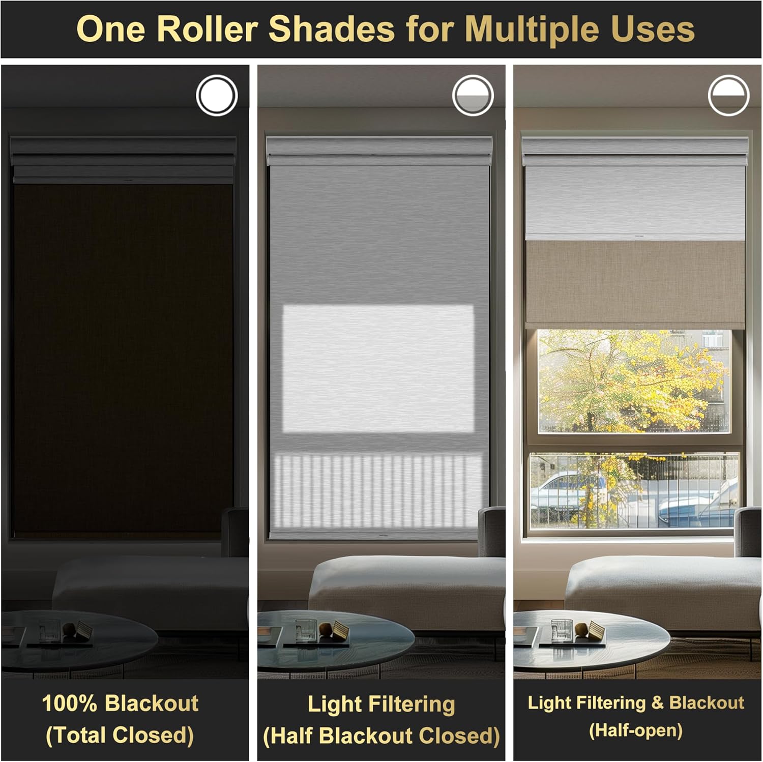 - MULTI-PURPOSE SHADE:Dual roller shades consisting of blackout and light filtering shades, blackout roller shade can 100% blackout,thermal insulation and UV Protection,so that you can experience quiet and comfort of the night during daytime;Light filtering roller shade allow light to filter into your room,and no glare,soft diffused light allow for perfect balance of light and darkness,and also enhances overall aesthetics of your home,allowing for a romantic and comfortable living environment.