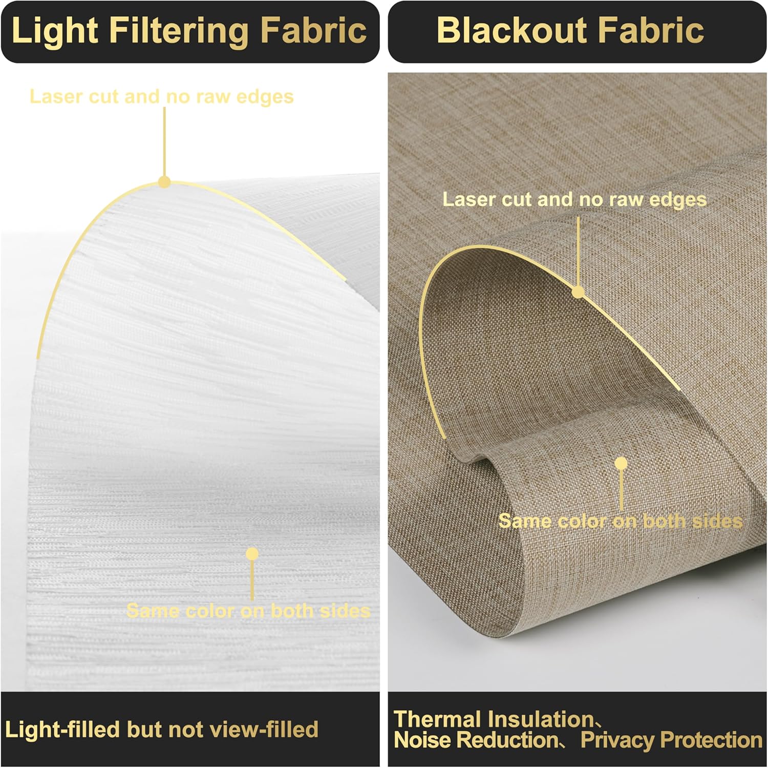 - CUSTOMIZED FABRICSïŒYou can choose the front and back order of blackout fabrics and light filtering fabrics. There are 20 types of blackout fabrics and 7 types of light filtering fabrics, including jacquard fabrics and linen fabrics. You can mix and match according to your personal preference. CUSTOMIZED SIZEïŒCustom width range 23"-86".Maximum height is 98" (fractional accuracy of 1/8). Customized Size please click the"Customize Size" button in the list to purchase