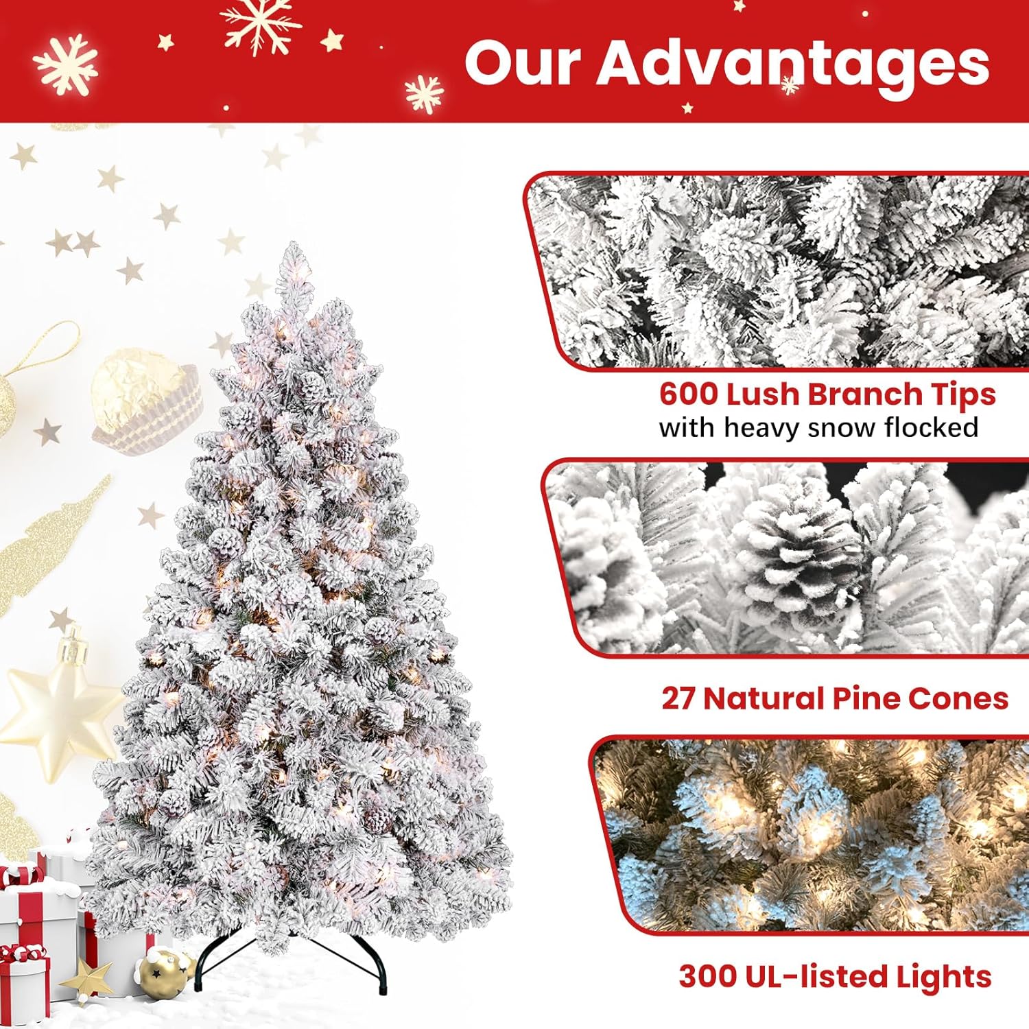 - Full Appearance: This small 5ft Christmas tree with LED lights has a diameter of 60 inches, 41 pine cones, 300 UL-listed plug-in lights, 600 snow flocking branches and a thickened & reinforced base, It makes our snow Christmas tree features a bushy full-bodied shape and feel realistic appearance. Let our lighted Christmas tree decor your room to create more magical moments.