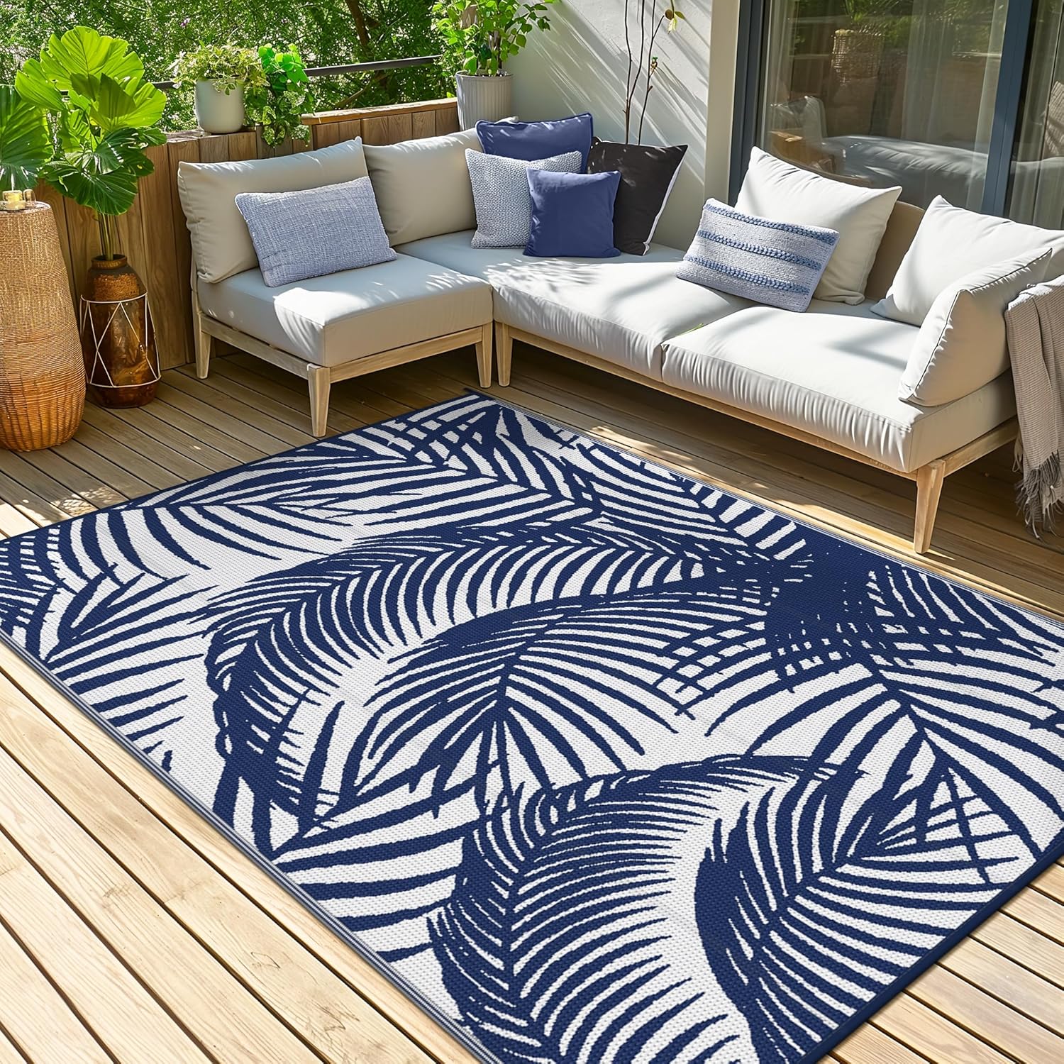 GENIMO Outdoor Rug 5' x 8' Waterproof for Patio Clearance, Reversible Plastic Straw Camping Carpet, Lightweight Mats for Rv, Backyard, Deck, Porch, Picnic, Beach, Balcony, Blue & White