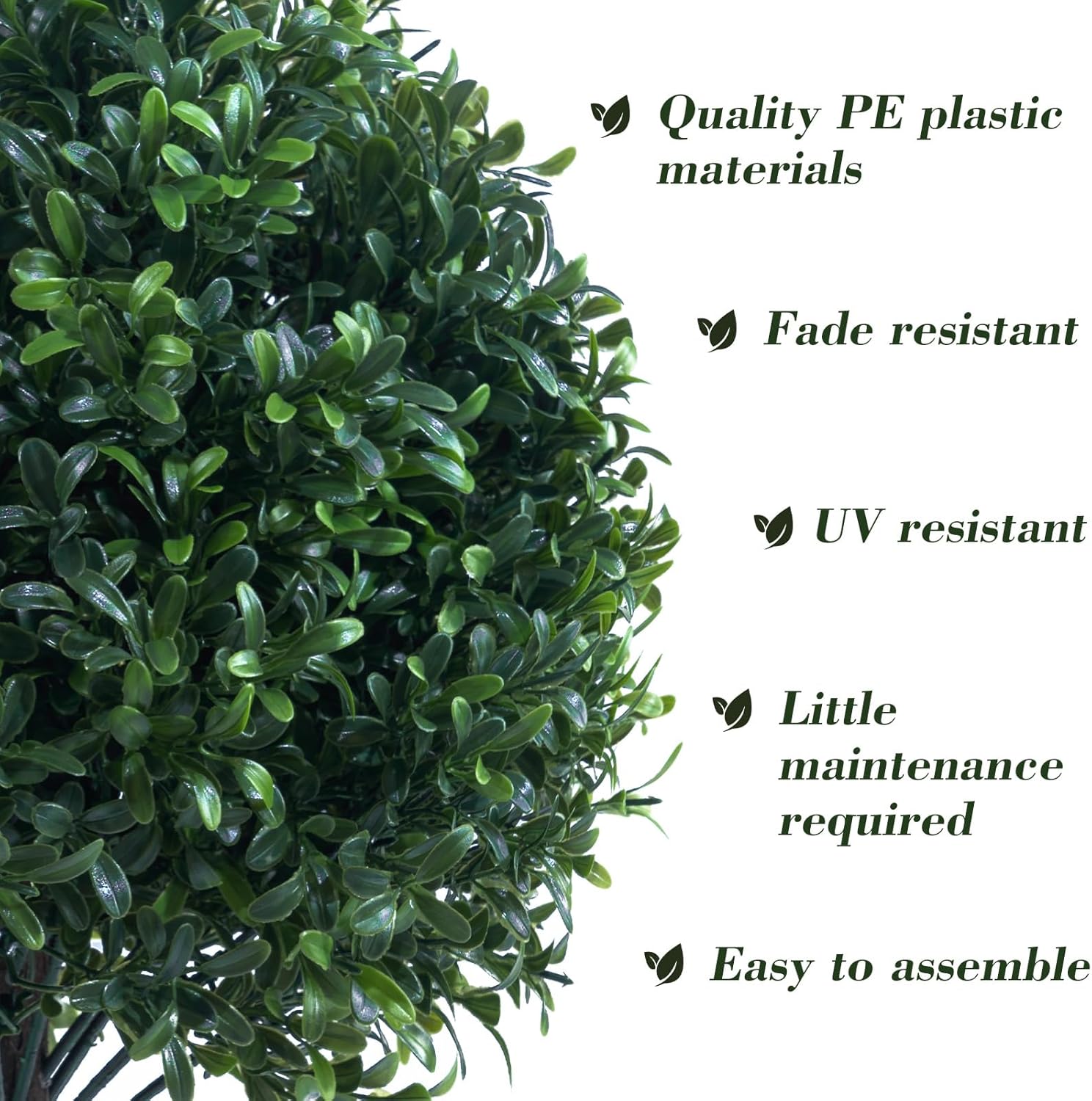 - ăEXCELLENT QUALITYă The 2 pack of artificial boxwood topiary ball bushes with spikes for outdoor & indoor are made from premium material, designed to be UV resistant, waterproof, and fade proof. SizeïŒ22"H x 15"D x 15"W (Including the 4.7 inch height spikes). We have enhanced the density of the leaves making them look more lifelike and lush. The surface of the branches also has features realistic textures