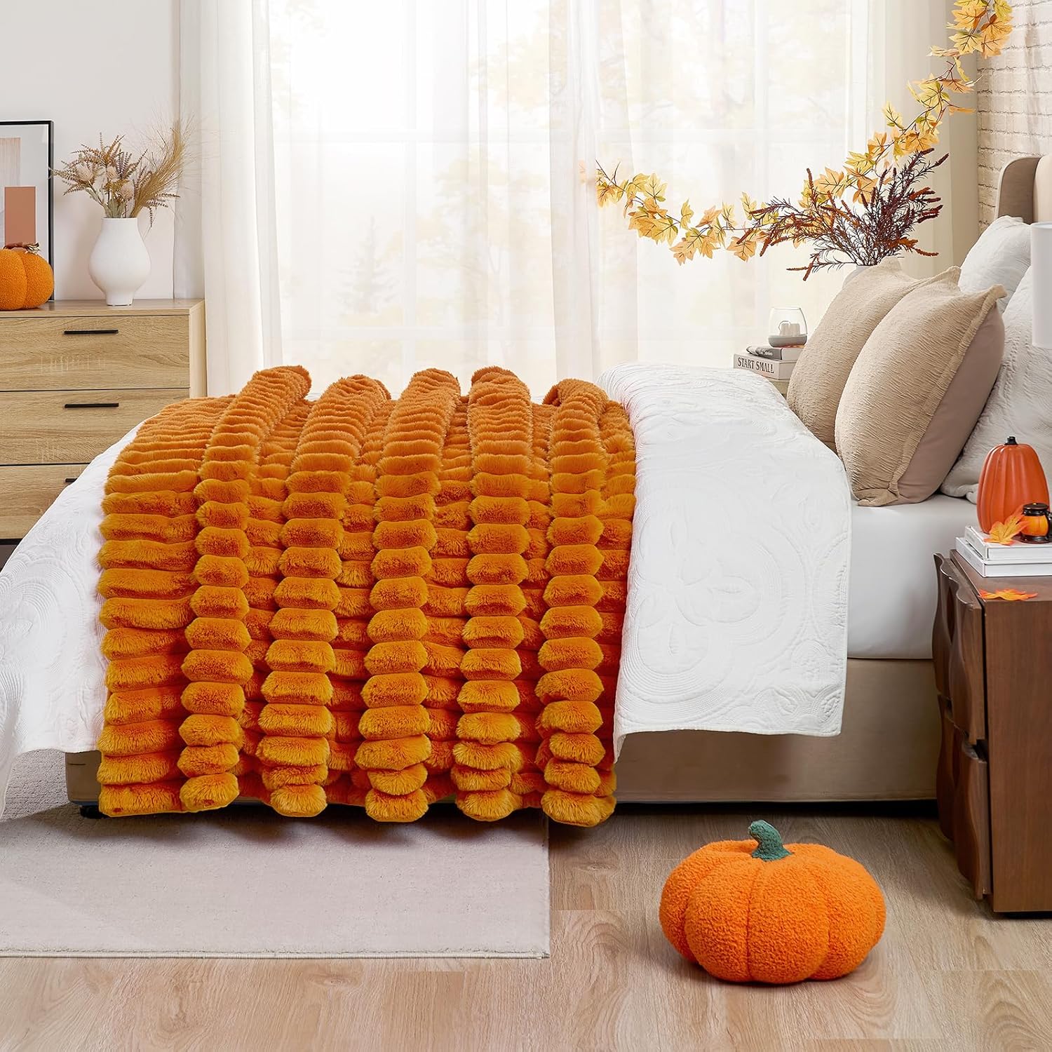 Cozy Bliss Fall Harvest Faux Fur Throw Blanket for Couch, Cozy Warm Plush Striped Blanket for for Decorating Couch Sofa Bedroom Living Room,50 * 60 Inches Burnt Orange