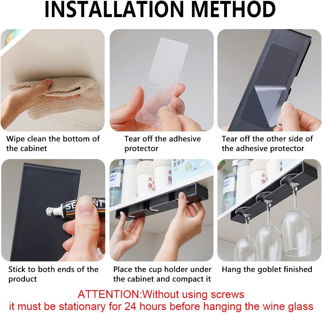 - Easy to Install: The wine glass rack is equipped with self-adhesive adhesive, Punch-free,easy to install,Due to the different materials of cabinets, Suitable for different installation environments:bar glass holder,wine cabinet,kitchen cabinet,under shelf in receiption room etc.