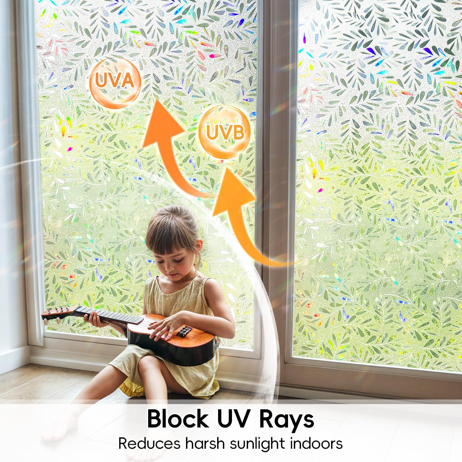 - Vibrant Visual Effects: When sunlight passes through the privacy window film, it creates a captivating rainbow effect. The leaf pattern, illuminated by daylight, displays dazzling colors that add a unique decorative touch. The shifting rainbow light enhances the aesthetics and style of your interior with a charming visual appeal. The base of the window film is a coarse, shiny frosted film, with the rainbow effect only on the leaf pattern