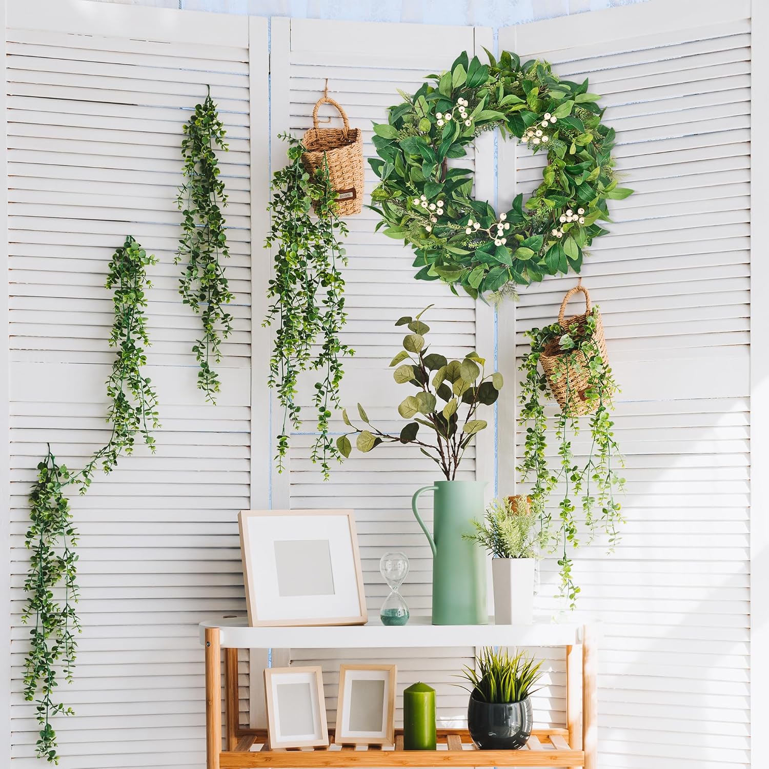 - 【Versatile All-Year-Round Use】: Suitable for all seasons and occasions, this door wreath can be hung on your front door to welcome guests, above the fireplace, or on a living room wall. It can also be used as a wedding wreath, welcome wreath, spring wreath, and more. Additionally, it makes a great gift for weddings, housewarming parties, Mother's Day, birthdays, and other holidays. - **Front Door Welcome**: Impress guests with a lush green greeting. - **Indoor & Farmhouse Charm**: Adorn walls, windows, mantels, or rustic kitchens. - **Outdoor Oasis **: Spruce up porches, patios, or garden gates.