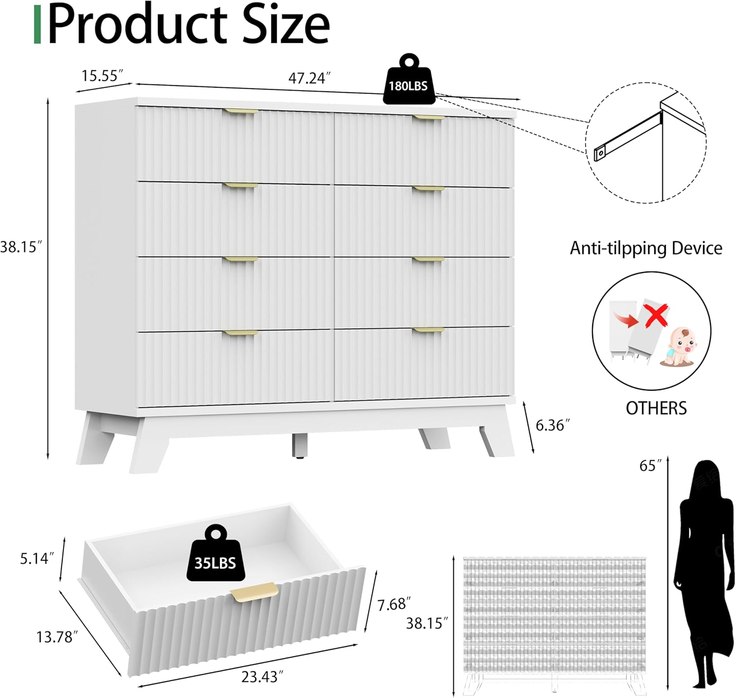 - ăStability & SafetyăThe white/black/natural oak dresser is equipped with an anti-tipping device, which can be fixed on the wall to prevent accidents. Each drawer contains a wide metal handle and built-in slide rail, easy to push and pull. Besides, the sturdy base provides this dresser with drawers a strong support and the middle feet can be adjustable to keep balance on uneven floors