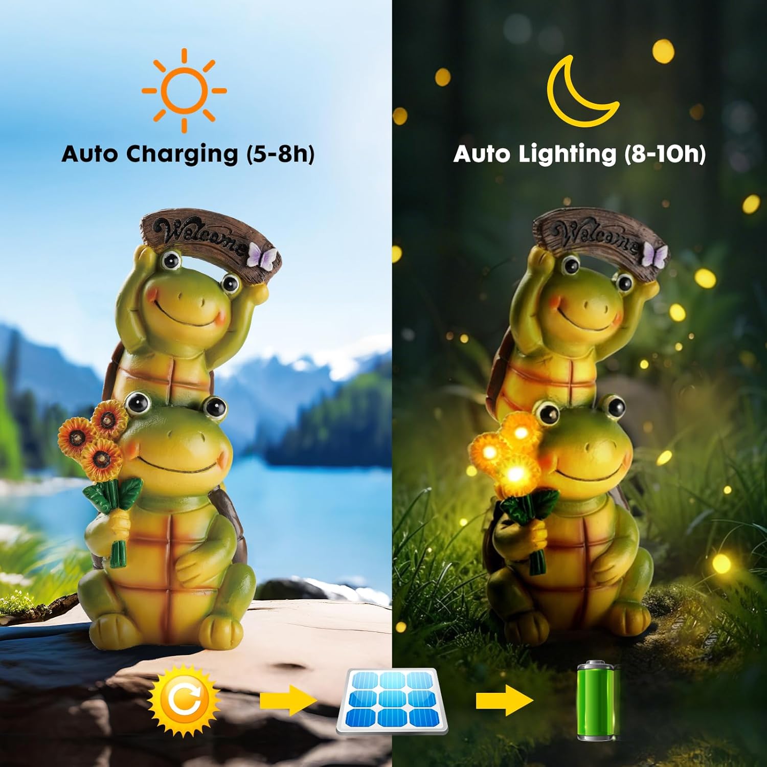 Garden Turtle Outdoor Statues, Solar Garden Statue Two Sweet Frog Face Turtles Decor with 3 LED Lights, Unique Art Resin Gifts for Patio Lawn Porch Yard