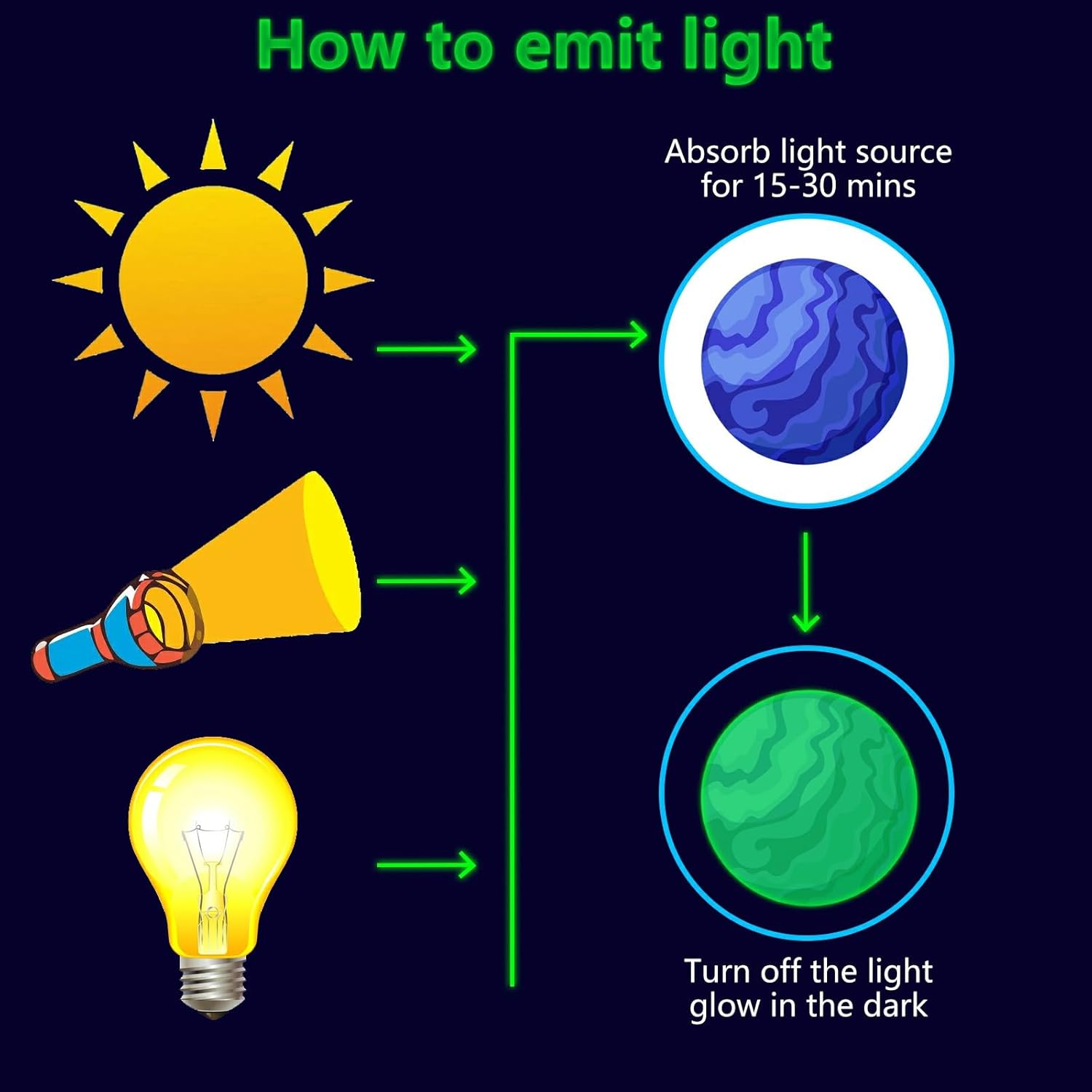 - ✦ Glow Stars Wall Decals: These glow wall decals for ceiling are made of quality luminous material,they will glow brightly when absorb enough light during the day. You just need to put it under lamplight flashlight ,room light or sunshine for 15 minutes, it will keep glowing for 8-10 hours with a gentle green fluorescent light. Please ensure the light shines on the decals without obstruction, the longer it takes to absorb light, then to light up for up to longer.